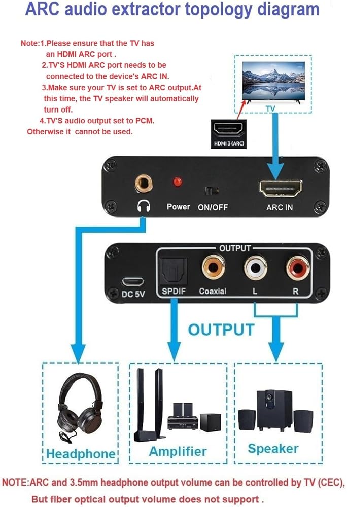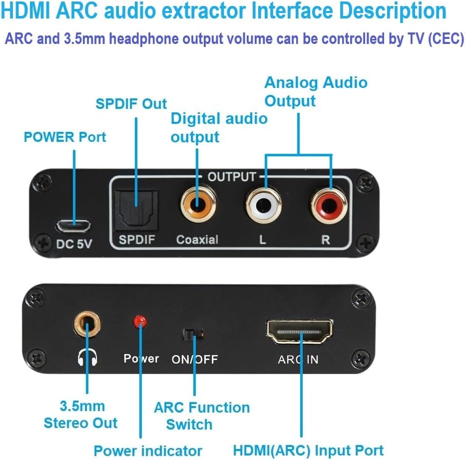 Extractor audio from TV of support ARC function to RCA ,Optical , 3.5mm, coaxial audio to the soundbar, amplifier system, stereo headphone ,home theater, etc.