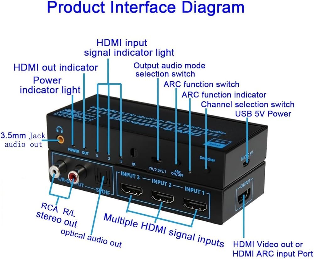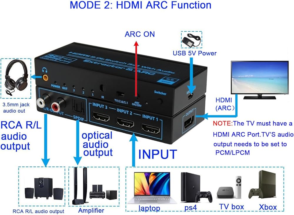 【ARC Function】HDMI 2.0 switcher supports ARC (Audio Return Channel), Extractor the Audio from TV to Sound bar or Amplifier. Connect your TV HDMI (ARC) Port to this switch HDMI Output Port with HDMI Cable, then using optical , 3.5mm or L/R cable connect to the Sound bar, Speaker, home theater, A/V receivers etc. No distortion of audio or video.