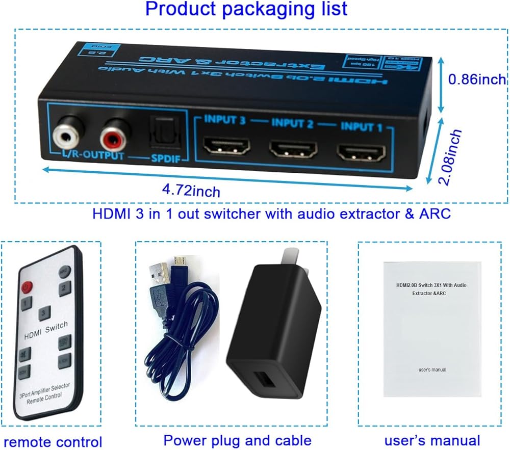 This is a high performance HDMI Switch 3 in 1 out with audio extractor and ARC function, it not only supports the 3 HDMI in and 1out, also it can make the audio separate from the input video source, output to an external stereo or surround device via optical SPDIF or RCA L/R. It support ARC function, Extractor the audio from TV (HDMI arc port )to Sound bar or Amplifier, This HDMI Switch will output the Dolby TRUE-HD,DTS-HD , AC3 , DTS , DSD audio format.