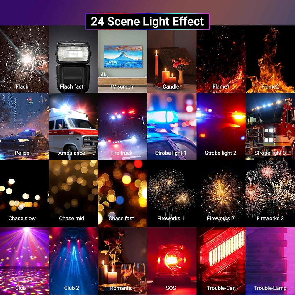 【24 Scene Modes】Supports 24 scene modes to meet your different needs: TV screen, candle, flame, club, romantic, flash, flash fast, police, ambulance, fire truck, strobe light, chase slow, chase mid, chase fast, fireworks, SOS, troublee-car, troublee-lamp.