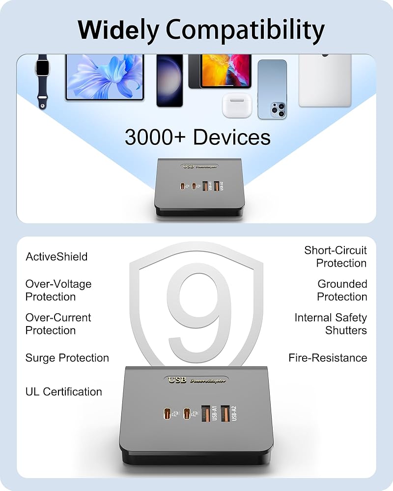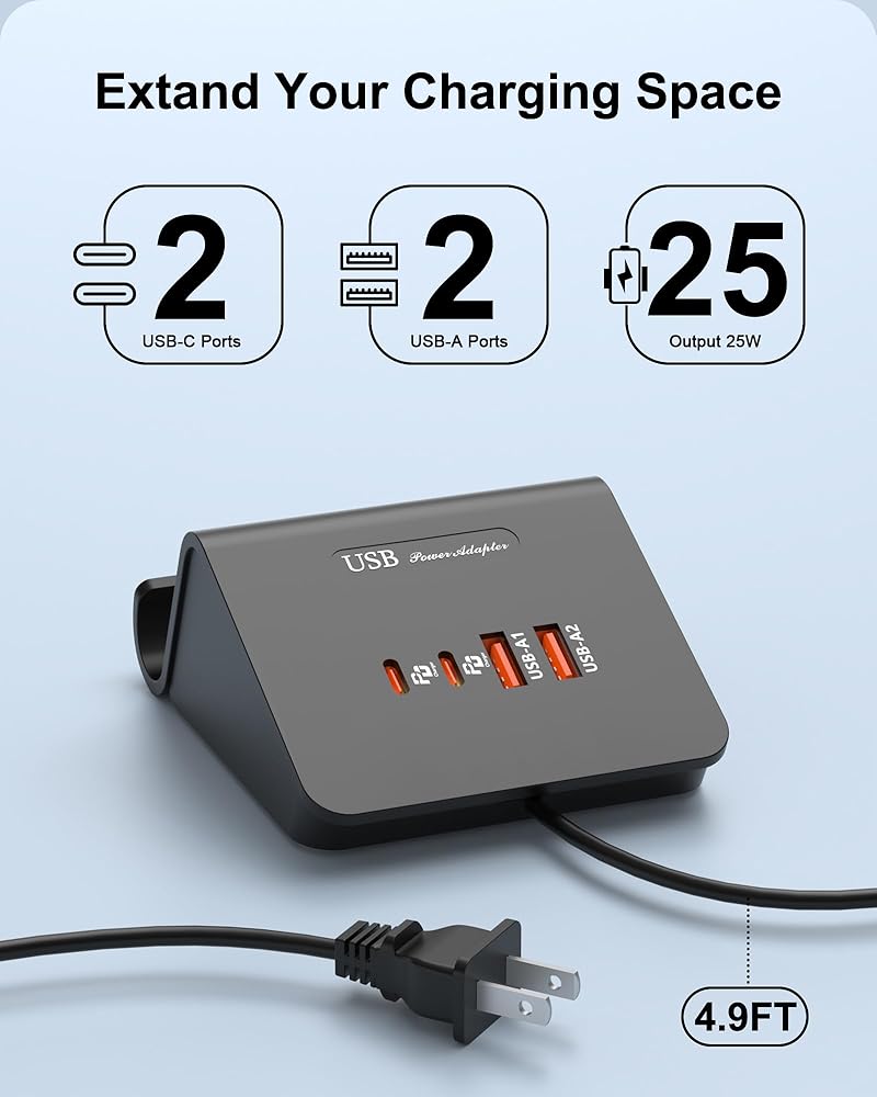 شحن أجهزة متعددة في وقت واحد: مع 2 منافذ USB A و2 USB C إجمالي 4 منافذ USB، تسمح لك محطة شاحن USB المتعددة هذه بشحن ما يصل إلى 4 أجهزة، مثالية لشحن iWatch/iPhone/Airpod/Tablet