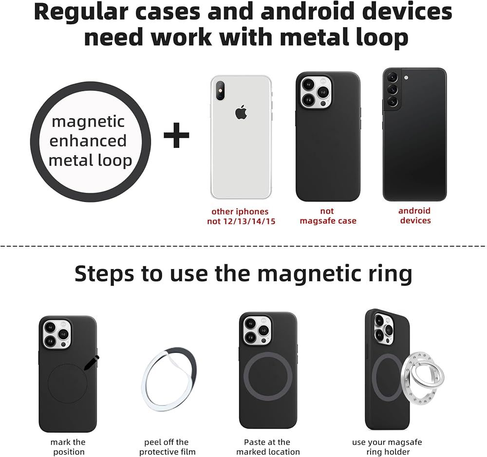 【توافق الجهاز】حامل حلقة الإصبع المغناطيسي هذا مناسب لسلسلة iPhone 15، 14، 13، 12 أو الهواتف المزودة بحافظة مغناطيسية MagSafe، استخدمه مباشرة دون أي ملحقات، إذا كنت تستخدم الحلقة المغناطيسية (في الصندوق)، فإن المغناطيس سوف كن أقوى. يجب استخدام الطرازات الأخرى من الهواتف المحمولة مع الحلقة المغناطيسية المجانية (الموجودة في العلبة). عندما تريد استخدام الشحن اللاسلكي لهاتفك الخلوي، ما عليك سوى إزالة حامل حلقة الإصبع المغناطيسي ووضعه على لوحة الشحن اللاسلكية لشحن هاتفك الخلوي لاسلكيًا (الحلقة المغناطيسية المعدلة غير متوافقة مع وظيفة الشحن اللاسلكي)