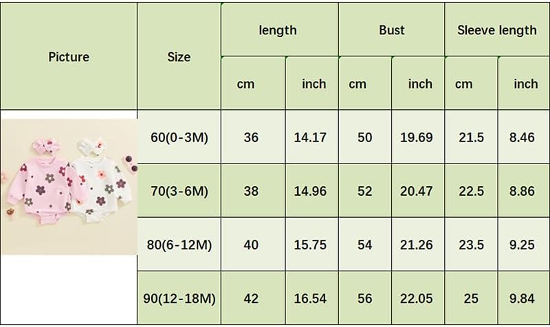 60 Length: 14.17 Bust: 19.68 Sleeve: 8.46 Advised Age: 0-3 Months