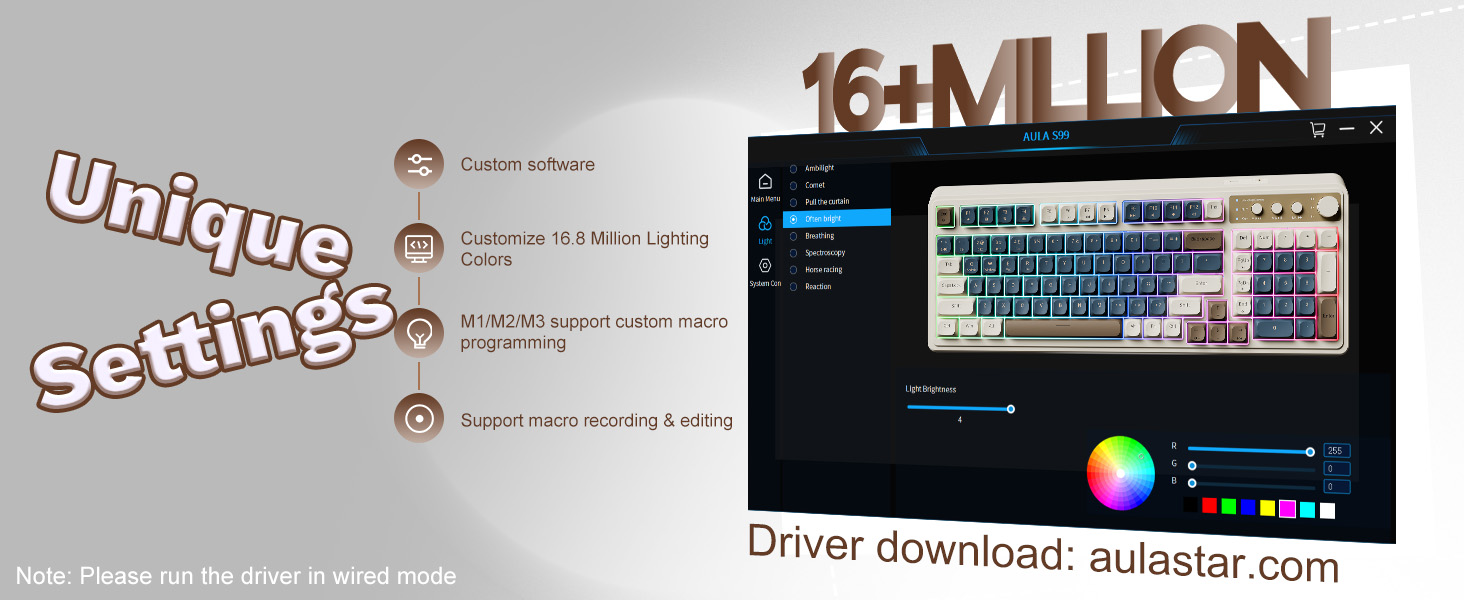 لوحة مفاتيح بإضاءة خلفية RGB رائعة: تتميز لوحة المفاتيح LED هذه بـ 16.8 مليون لون ضوء RGB، مع 16 تأثير إضاءة محدد مسبقًا لإضافة جو رائع للعبة. يمكن تعديل سطوع الإضاءة وسرعتها بواسطة المقبض أو مجموعة مفاتيح FN+. باستخدام Macro soft، يمكنك إنشاء إعداد إضاءة فريد لجعل لوحة مفاتيح rgb الخاصة بك أكثر إثارة للاهتمام وإنشاء بيئة عمل أو ألعاب مخصصة