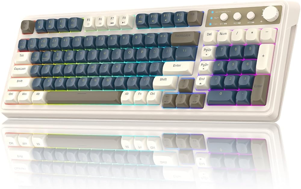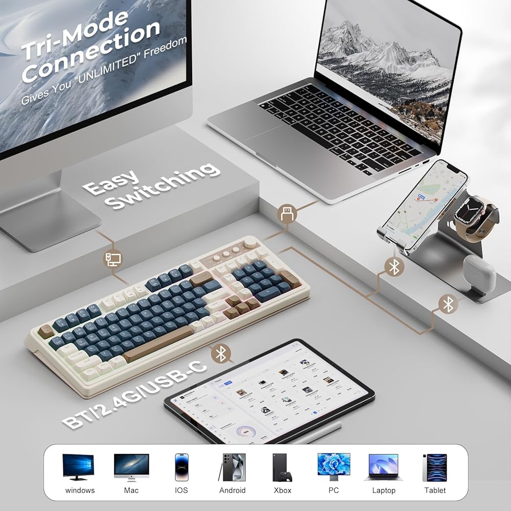 لوحة مفاتيح ألعاب AULA 99 مفتاحًا، بلوتوث ثلاثي الوضع/2.4 جيجا هرتز/USB-C لوحة مفاتيح كريمية قديمة مع لوحة أرقام بإضاءة خلفية RGB، مقبض وسائط لوحة مفاتيح كمبيوتر غشائية قابلة للبرمجة لأجهزة MAC Xbox PC Gamer - أزرق