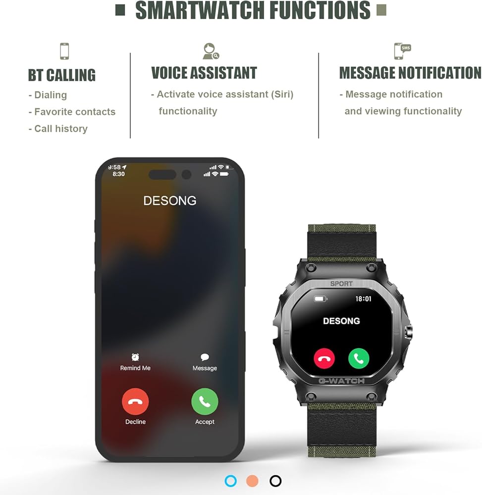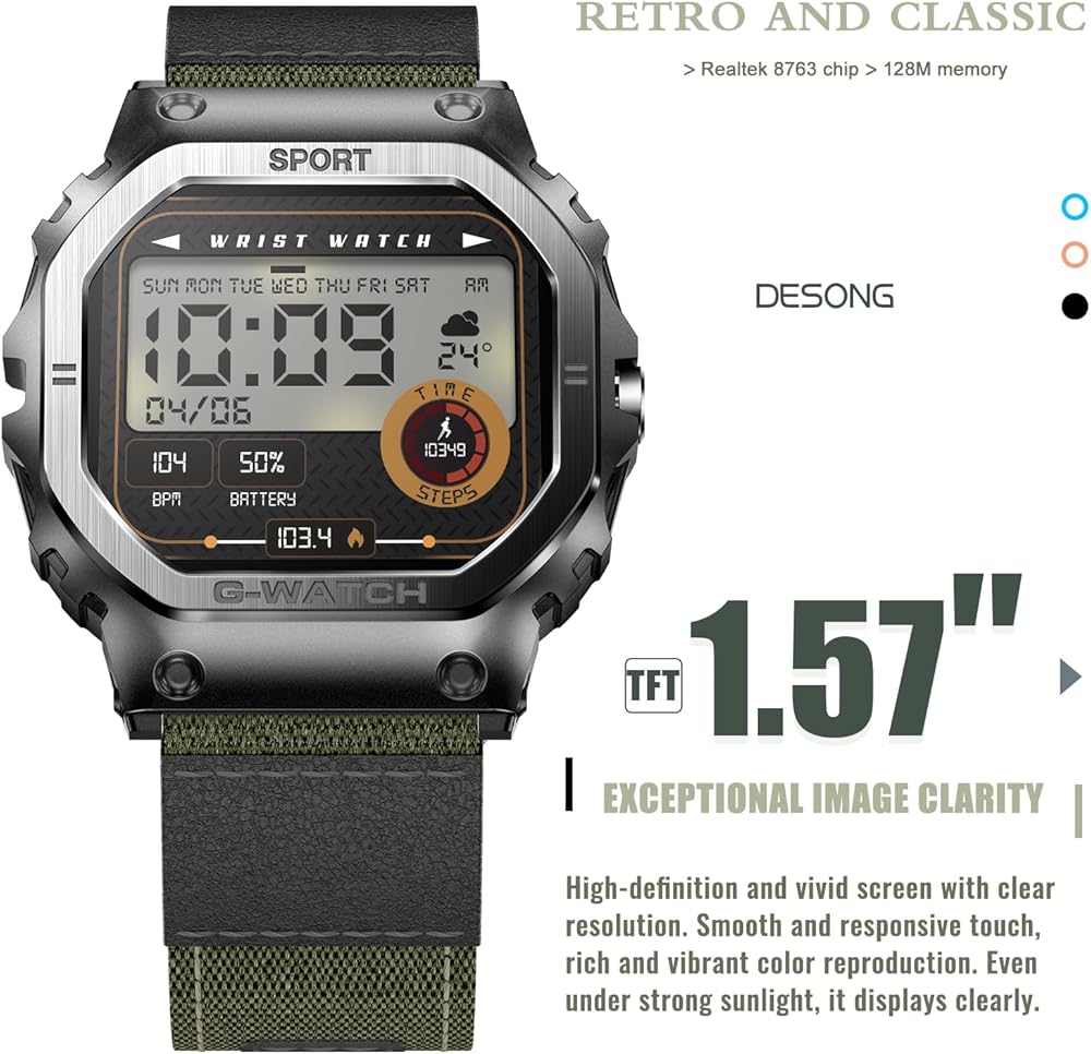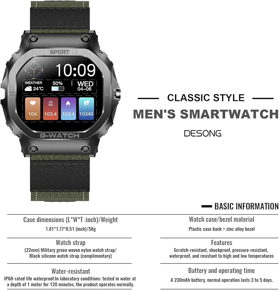 [شاشة عالية الدقة وساعة مقاومة للماء IP68] ساعات Desong Military الذكية للرجال مصنوعة من مواد معدنية عالية الجودة قوية ومقاومة للسقوط، ولن تتضرر مكوناتها المتكاملة بسبب الاهتزازات. الساعة الذكية القوية هي شاشة تعمل باللمس، مع شاشة عالية السطوع مقاس 1.57 بوصة ودقة 240*286، مما يوفر تجربة بصرية أفضل. يمكن ارتداء الساعة أثناء غسل اليدين، ولكن ليس أثناء السباحة أو الغوص لأنها ستتداخل مع مكبرات الصوت المدمجة.