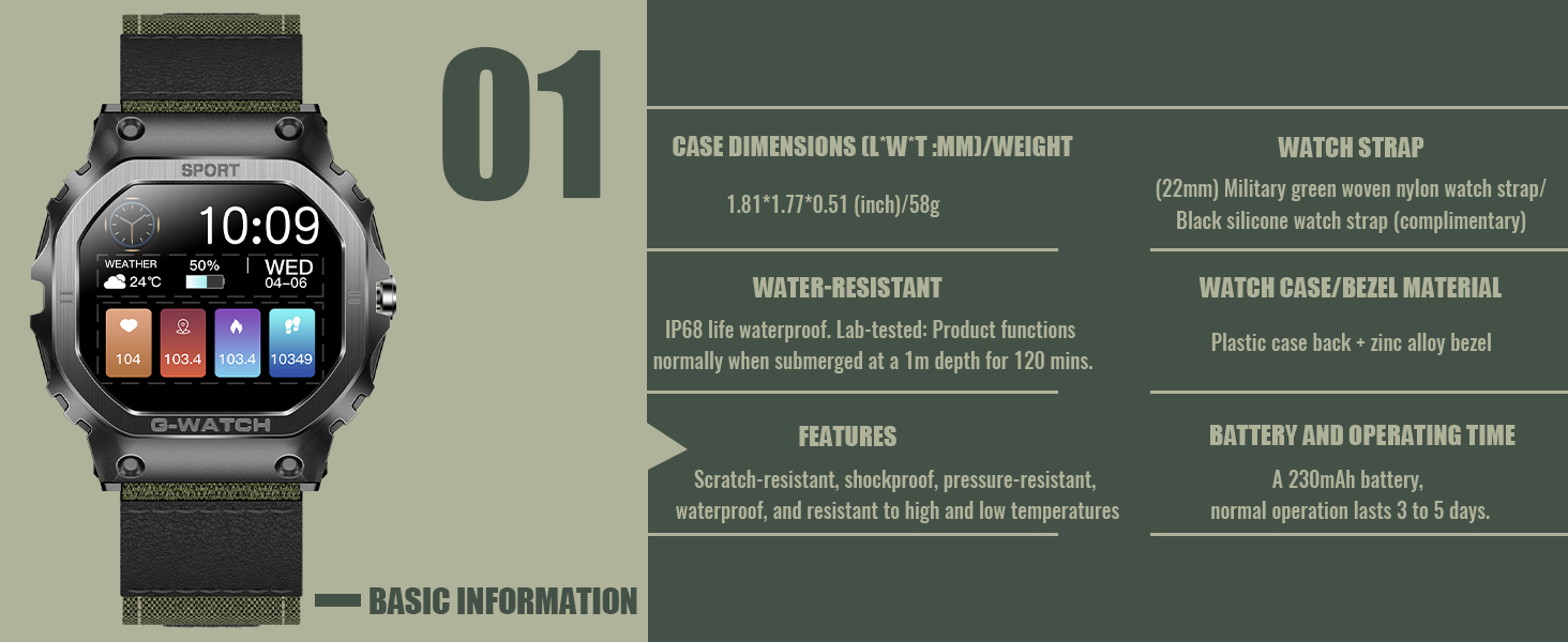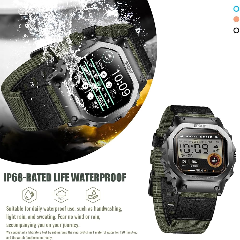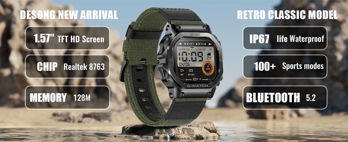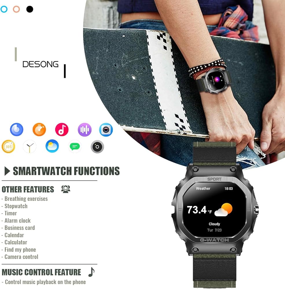 [شاشة عالية الدقة وساعة مقاومة للماء IP68] ساعات Desong Military الذكية للرجال مصنوعة من مواد معدنية عالية الجودة قوية ومقاومة للسقوط، ولن تتضرر مكوناتها المتكاملة بسبب الاهتزازات. الساعة الذكية القوية هي شاشة تعمل باللمس، مع شاشة عالية السطوع مقاس 1.57 بوصة ودقة 240*286، مما يوفر تجربة بصرية أفضل. يمكن ارتداء الساعة أثناء غسل اليدين، ولكن ليس أثناء السباحة أو الغوص لأنها ستتداخل مع مكبرات الصوت المدمجة.