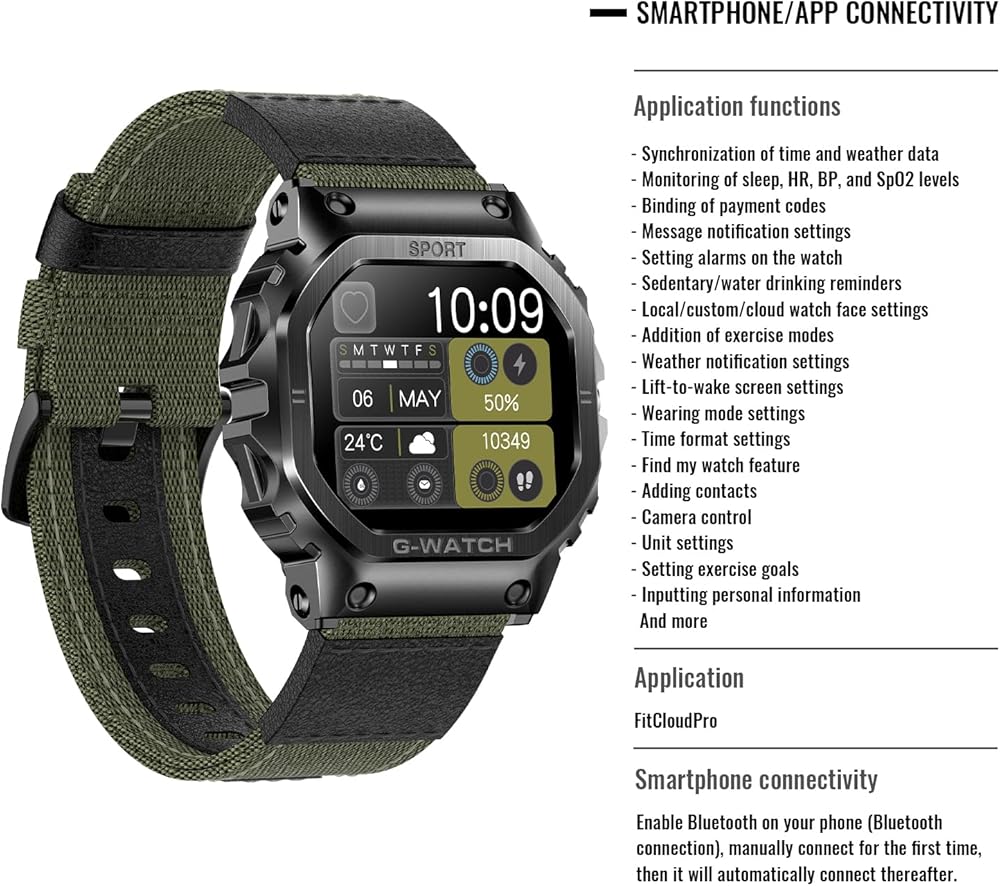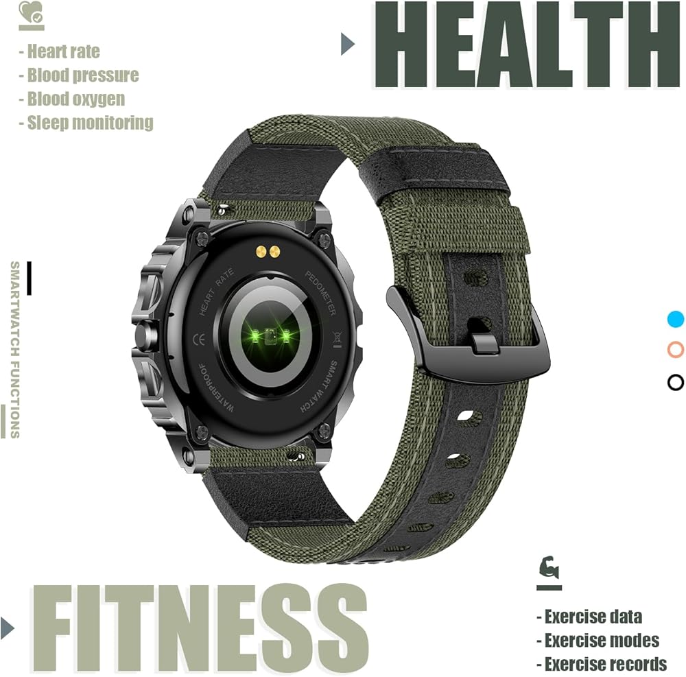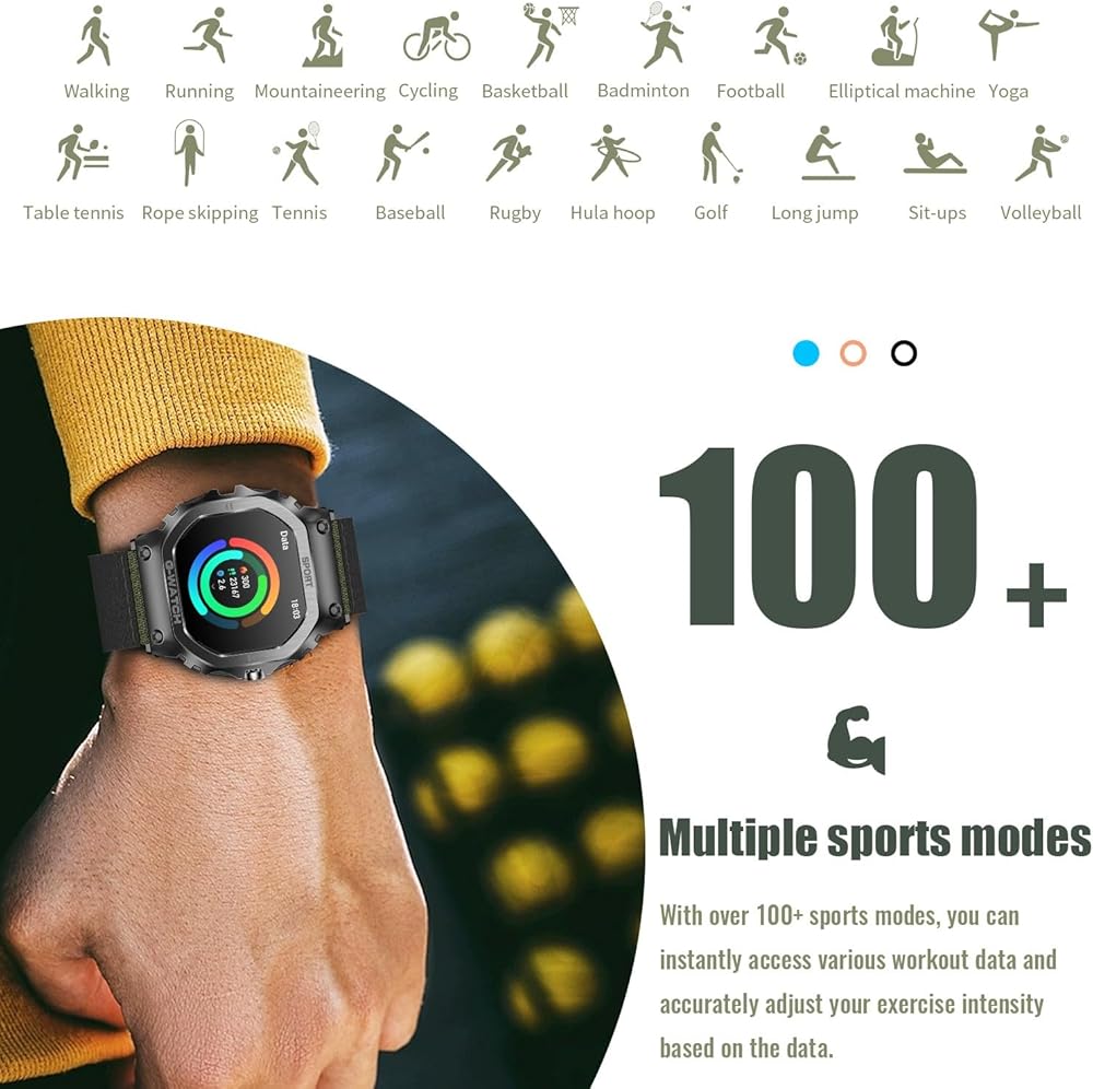 [الأنشطة اليومية والوظائف العملية]: تتميز الساعة الرياضية بأوضاع رياضية مختلفة مثل المشي والجري والتنزه سيرًا على الأقدام وركوب الدراجات وحبل القفز وكرة السلة وكرة الريشة وكرة القدم واليوجا وما إلى ذلك، لتلبية احتياجاتك الرياضية اليومية. يمكنه تتبع الأنشطة طوال اليوم بدقة مثل الخطوات والمسافة والسعرات الحرارية ووقت التمرين ومعدل ضربات القلب. توفر هذه الساعات التكتيكية أيضًا وظائف مفيدة أخرى مثل المساعد الصوتي AI، وكاميرا الهاتف عن بعد، والإناث، والتحكم في الموسيقى، وتوقعات الطقس، وساعة المنبه، وساعة التوقف والمزيد.