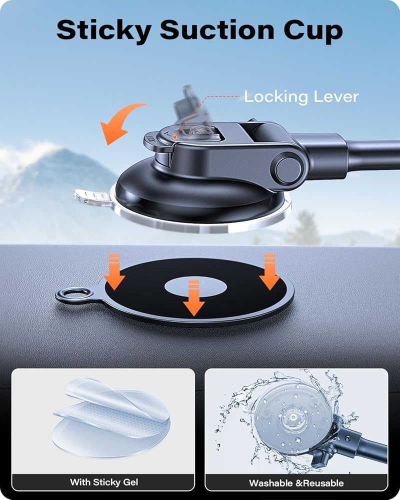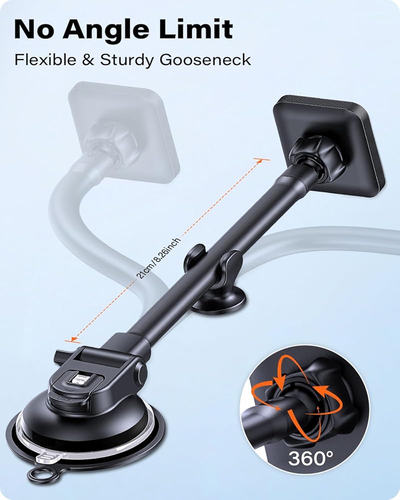 سهولة التركيب: يتميز حامل الهاتف بعملية تركيب بسيطة وسهلة. يمكن تثبيته على لوحة قيادة السيارة أو الزجاج الأمامي باستخدام الوسادة اللاصقة المتضمنة أو كوب الشفط. يمكن تعديل الذراع الطويلة ذات العنق المعقوفة بسهولة إلى الوضع المرغوب فيه، ويمكن تثبيت الهاتف بشكل آمن في مكانه ببضع نقرات فقط.