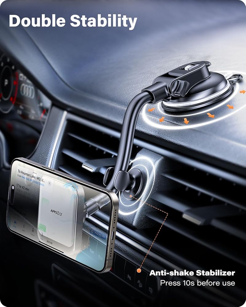 مثبت مضاد للاهتزاز: يتميز حامل الهاتف بمثبت مضاد للاهتزاز مع وسادة سيليكون وذراع مرن، مما يقلل بشكل فعال من الاهتزاز والاهتزاز عند القيادة. ويضمن ذلك بقاء هاتفك مستقرًا وآمنًا، حتى أثناء القيادة بسرعة عالية أو الطرق الوعرة.
