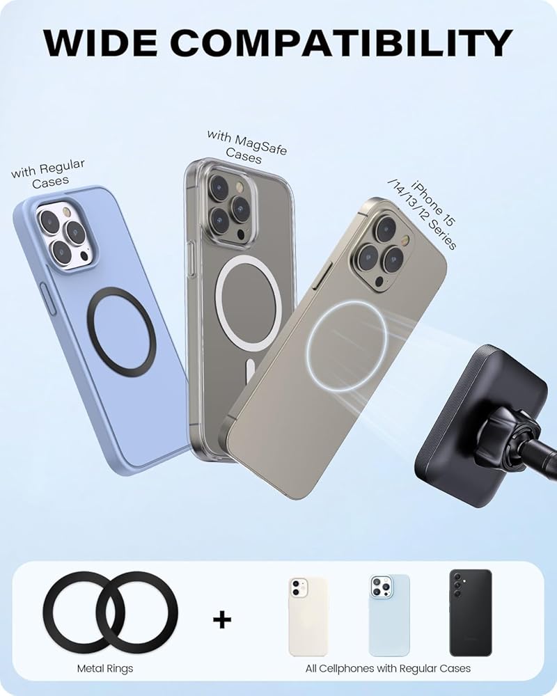 توافق عالمي: يعمل مباشرة مع iPhone 15/14/13/12 Pro Max Mini وحافظة Magsafe الرسمية، لا حاجة لربط حلقة معدنية إضافية.
