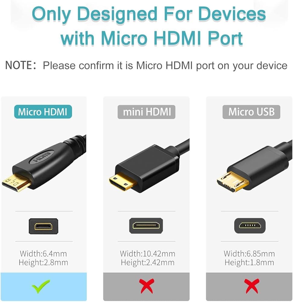 【ملاحظة: 】: هذا المنتج عبارة عن Micro HDMI إلى HDMI القياسي، وليس Micro USB إلى HDMI. لا يمكن أن يناسب هاتف Samsung أو الجهاز اللوحي المزود بمنفذ Micro USB. منفذ Micro HDMI (العرض: 6.4 ملم، الارتفاع: 2.8 ملم)، يرجى التأكد من منفذ جهازك قبل الشراء.