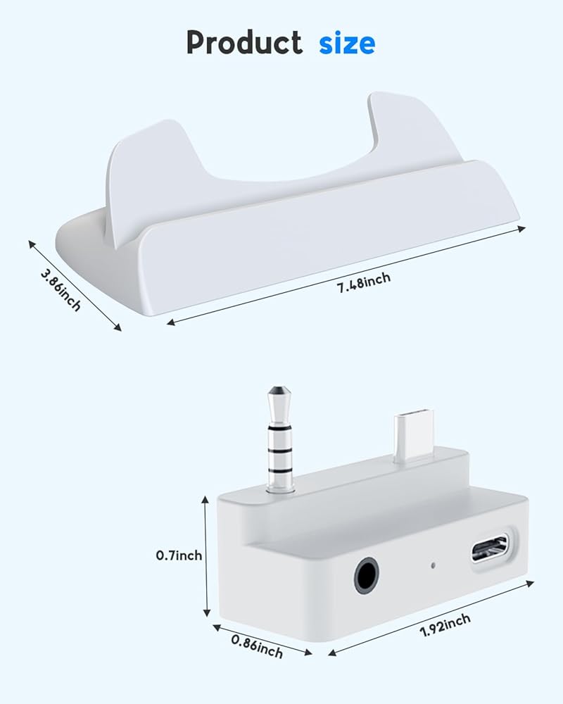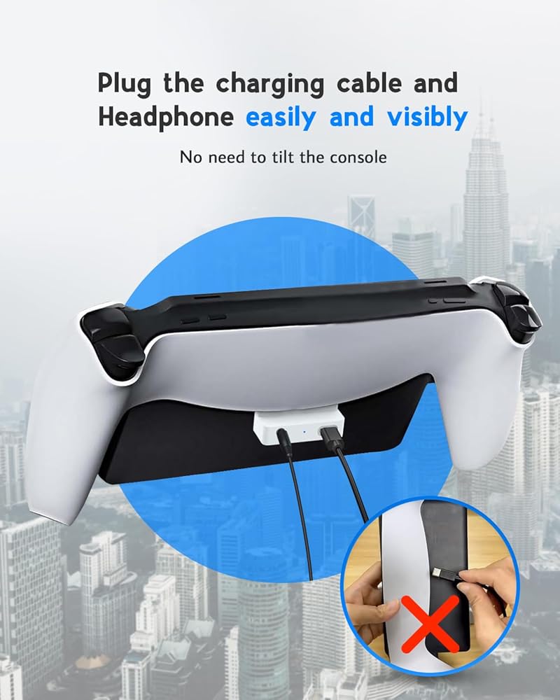 【90-Degree Angle Design】This USB-C male to USB-C female and 3.5mm male to female headphone jack adapter for PS Portal with an 90 degree L shape, makes it easy and visible to plug the charging cable and headphone. No need to tilt the console each time you plug the cable. You can charge the PS Portal when it is store on the stand.