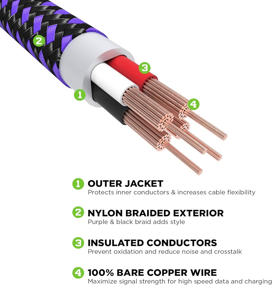 تصميم فاخر: كابل مستدير يقاوم التشابك، بينما يعمل الجزء الخارجي الأنيق المضفر من النايلون مع تصميم مرن لتخفيف الضغط على تحسين المتانة.