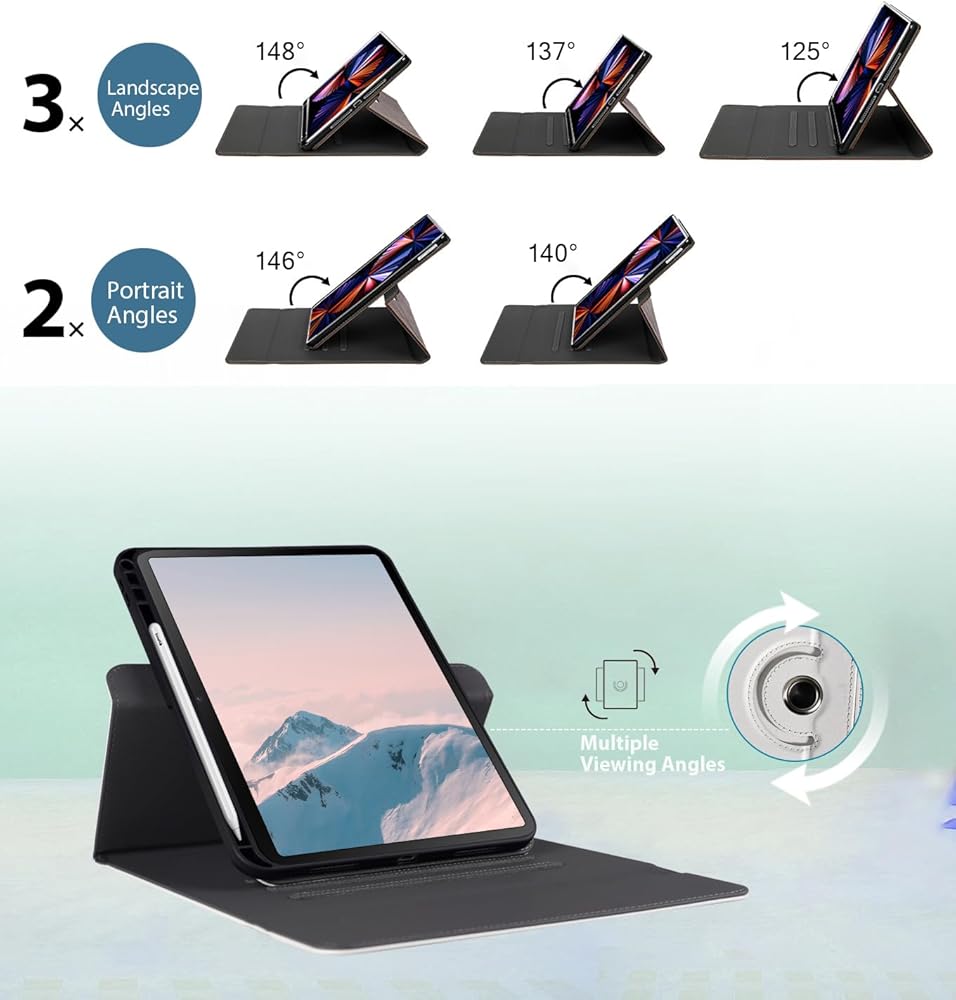 • [اعثر على أفضل زاوية لديك]: يتميز الجراب الخلفي بقرص دوار قابل للدوران 360 درجة لوضع جهازك اللوحي أفقيًا أو رأسيًا. كما أنها تحتوي على 3 أخاديد مضادة للانزلاق، تدعم ما يصل إلى 5 زوايا رؤية مختلفة (3 أفقية، 2 عمودية)