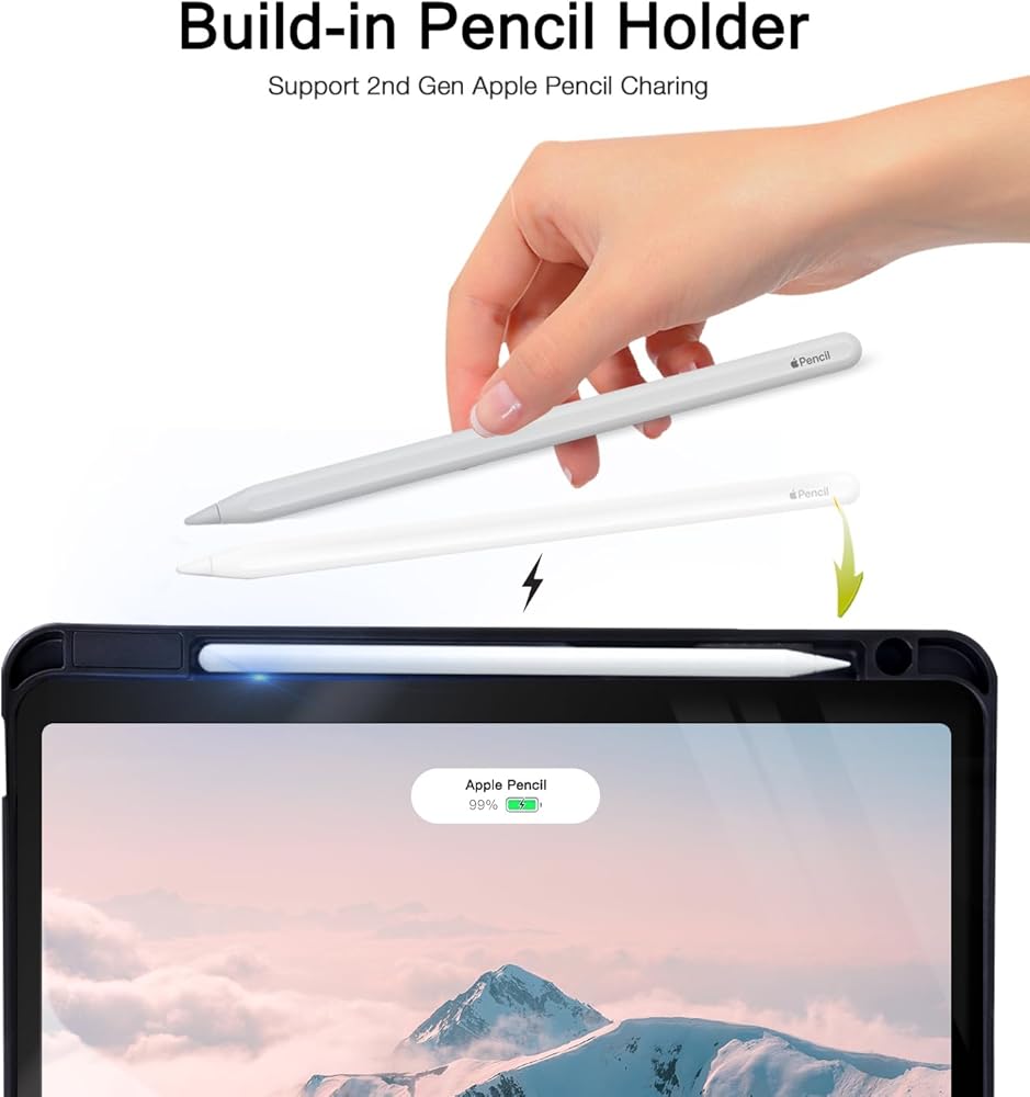 • [دعم الجيل الثاني من شحن قلم Apple]: تم تجهيز حافظة iPad Air من الجيل السادس / الخامس / الرابع بحامل قلم رصاص مدمج للسماح بوضع القلم الرصاص وإزالته بسهولة، مع دعم الشحن اللاسلكي أيضًا على الجانب الأيمن.