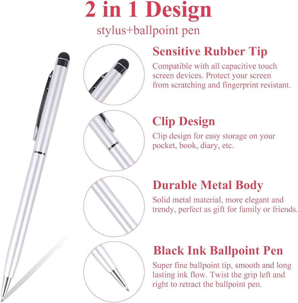 2 in 1 Design Stylus Pens: One side contains sensitive stylus for touch screens. Twist the stylus pen body to extend the black ink ballpoint pen on the other side for convenient writing. Smooth and long lasting ink flow.