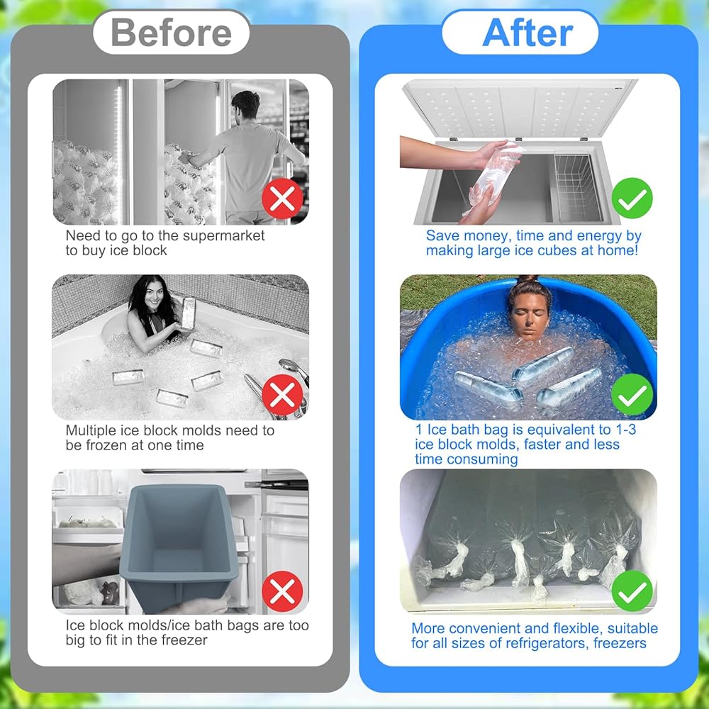 Easy Quick Freeze Ice Bath Bags: Our disposable plastic ice bath bags help you quickly freeze large quantities of water in the same amount of time, instantly transforming your regular bathtub into a therapeutic cold plunge tub that will help you to recover from intense workouts, relieve muscle soreness and enhance mental control by reducing inflammation and boosting immunity.