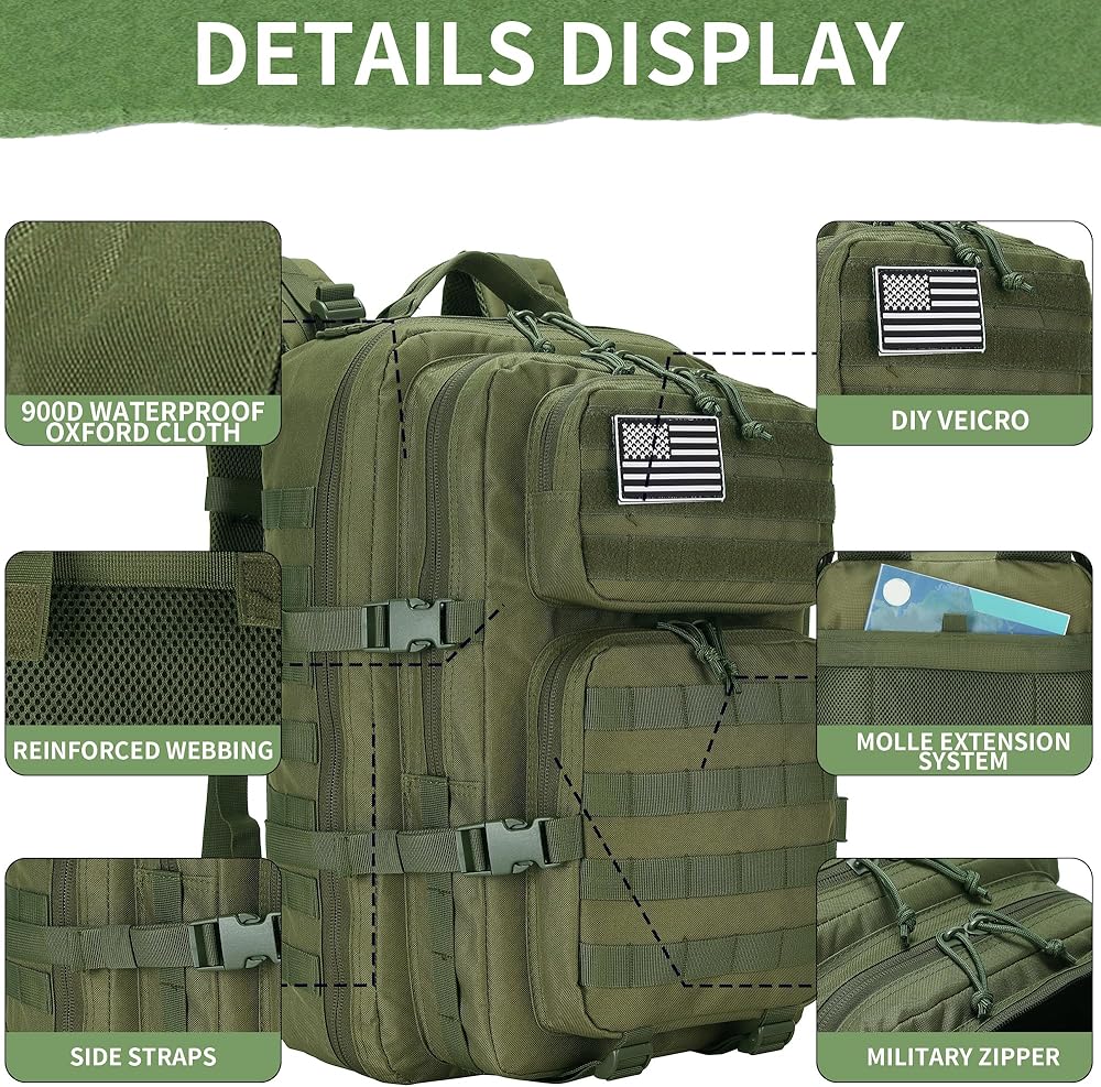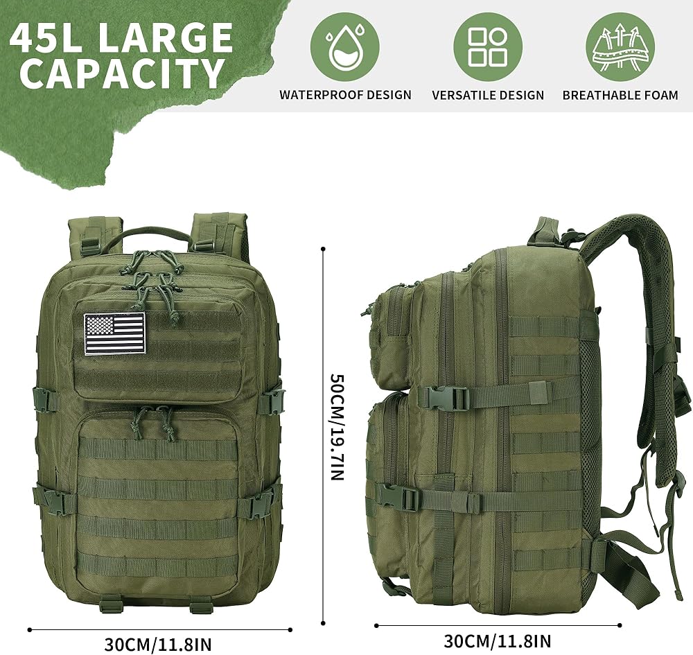 Military Tactical backpack size approx: 11.8inch x 19.8inch x 11.8inch, Capacity: 45L,Military backpack is made of 600 oxford nylon fabric, durable and water-resistant. Suitable for fitness, travel, hiking, camping, and other outdoor activities.