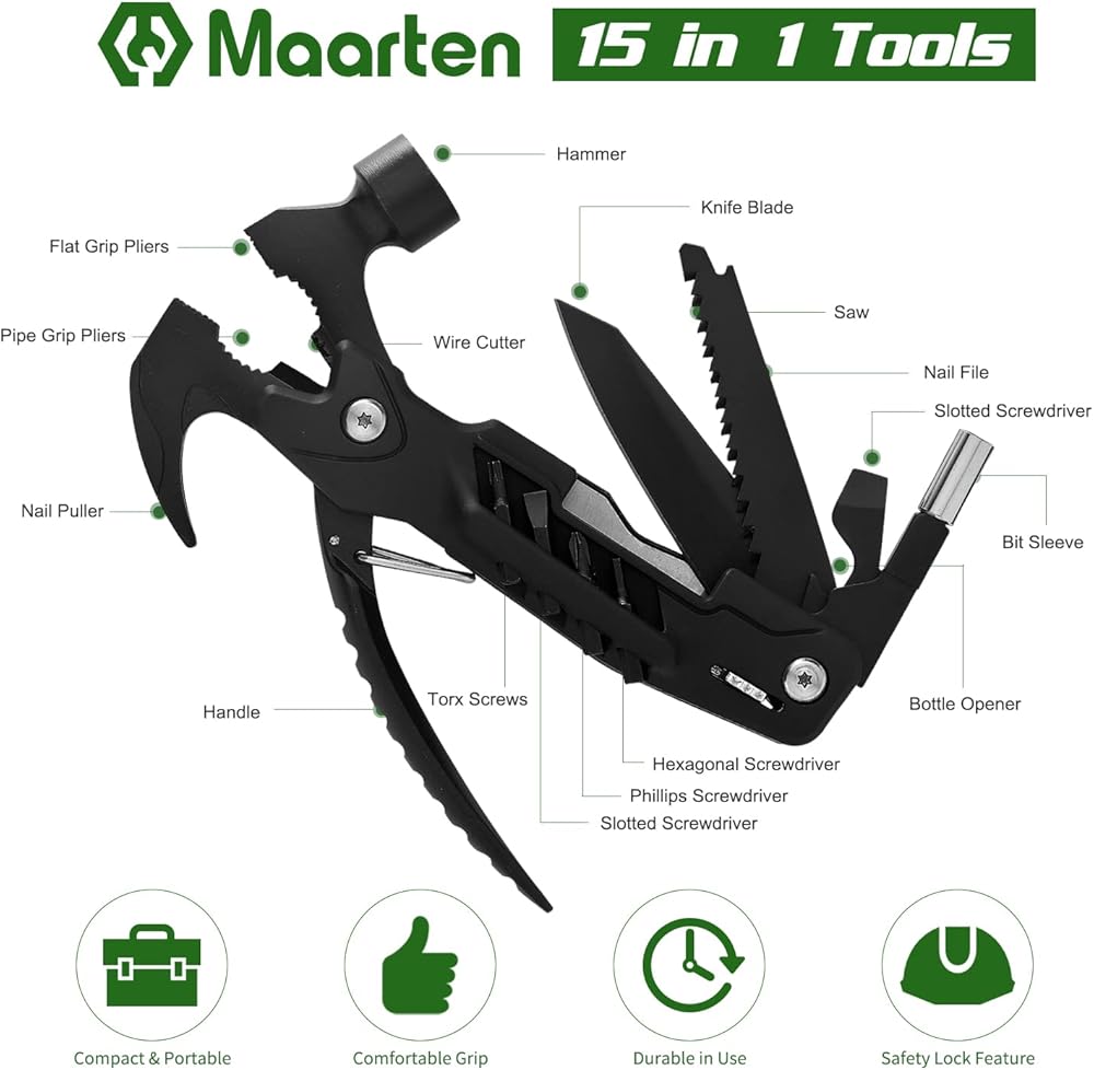 • 【آمنة وآمنة】المطرقة متعددة الأدوات المزودة بقفل أمان، جميع ميزات القفل تعني أن كل أداة وأداة متعددة سيتم قفلها عند فتحها بالكامل، مما يبقيك آمنًا والأدوات في مكانها بشكل آمن. هو مساعد جيد في الحياة.
