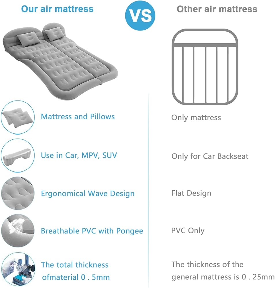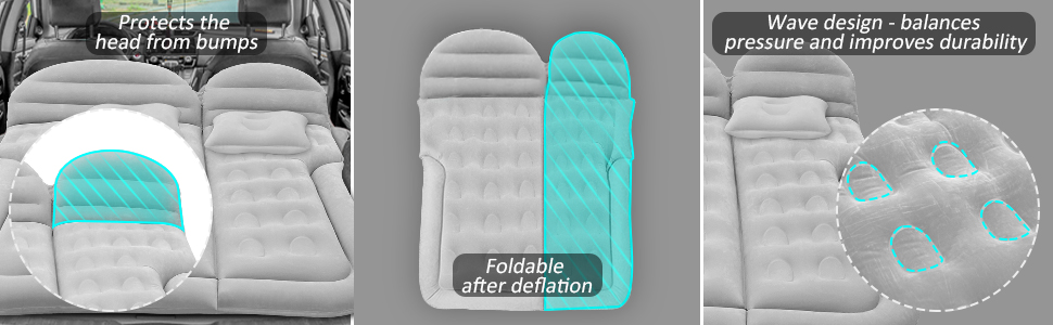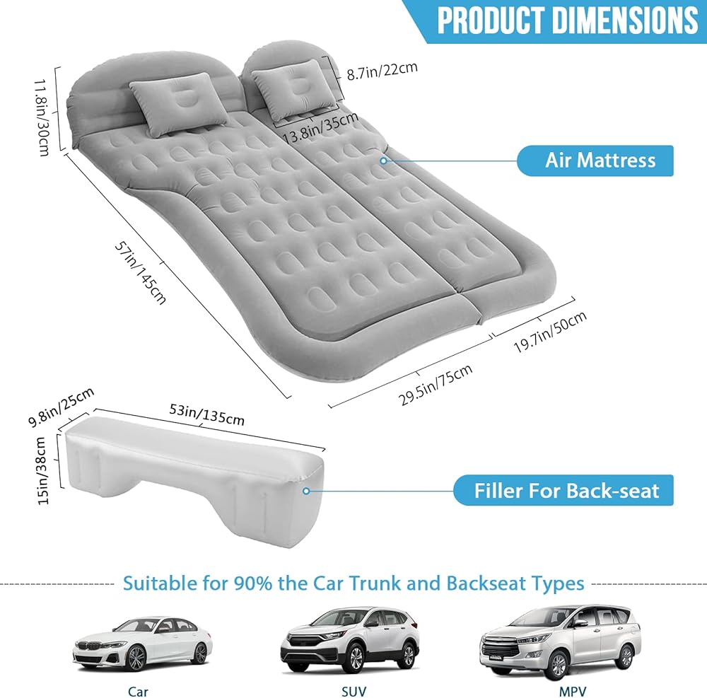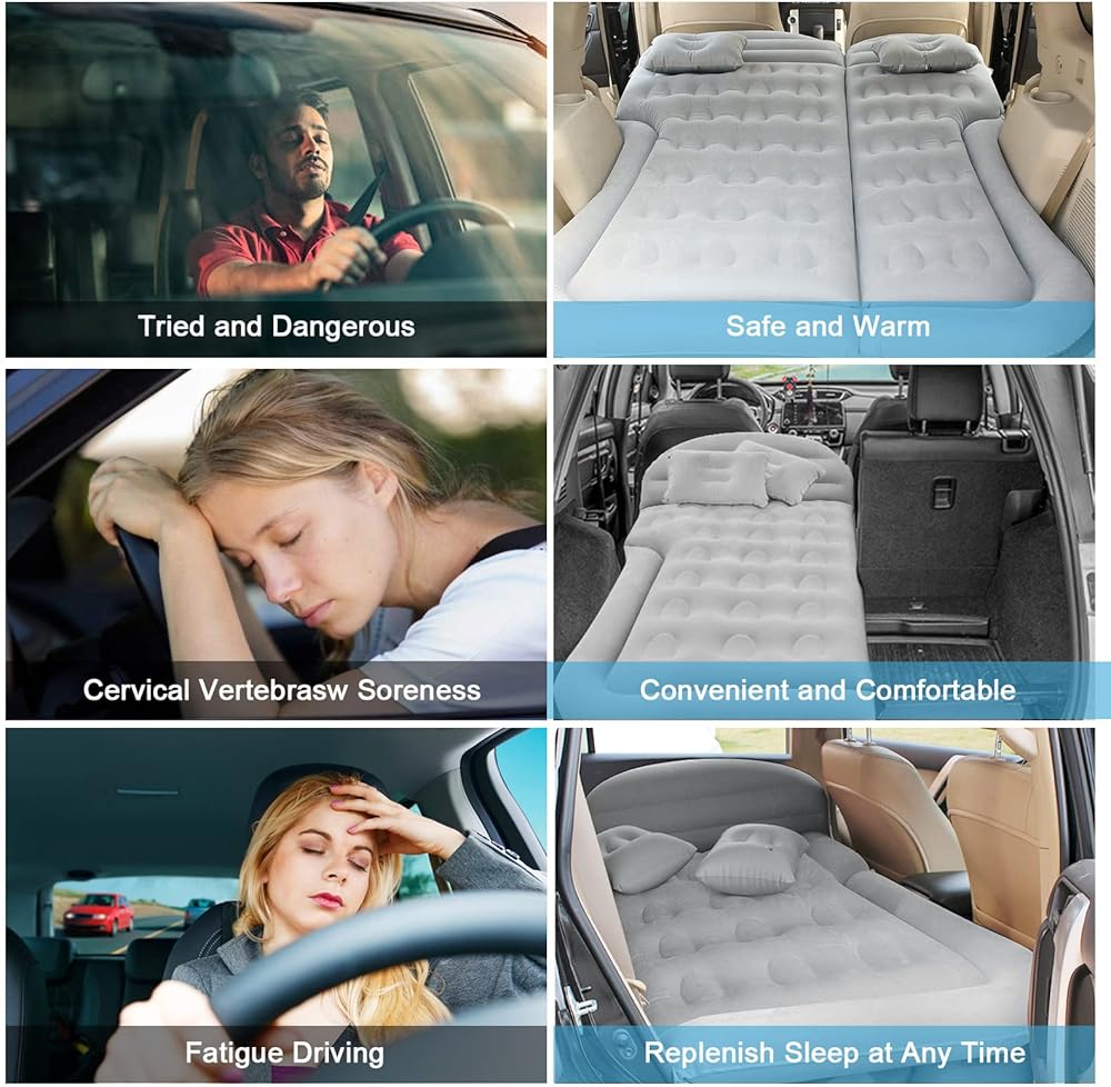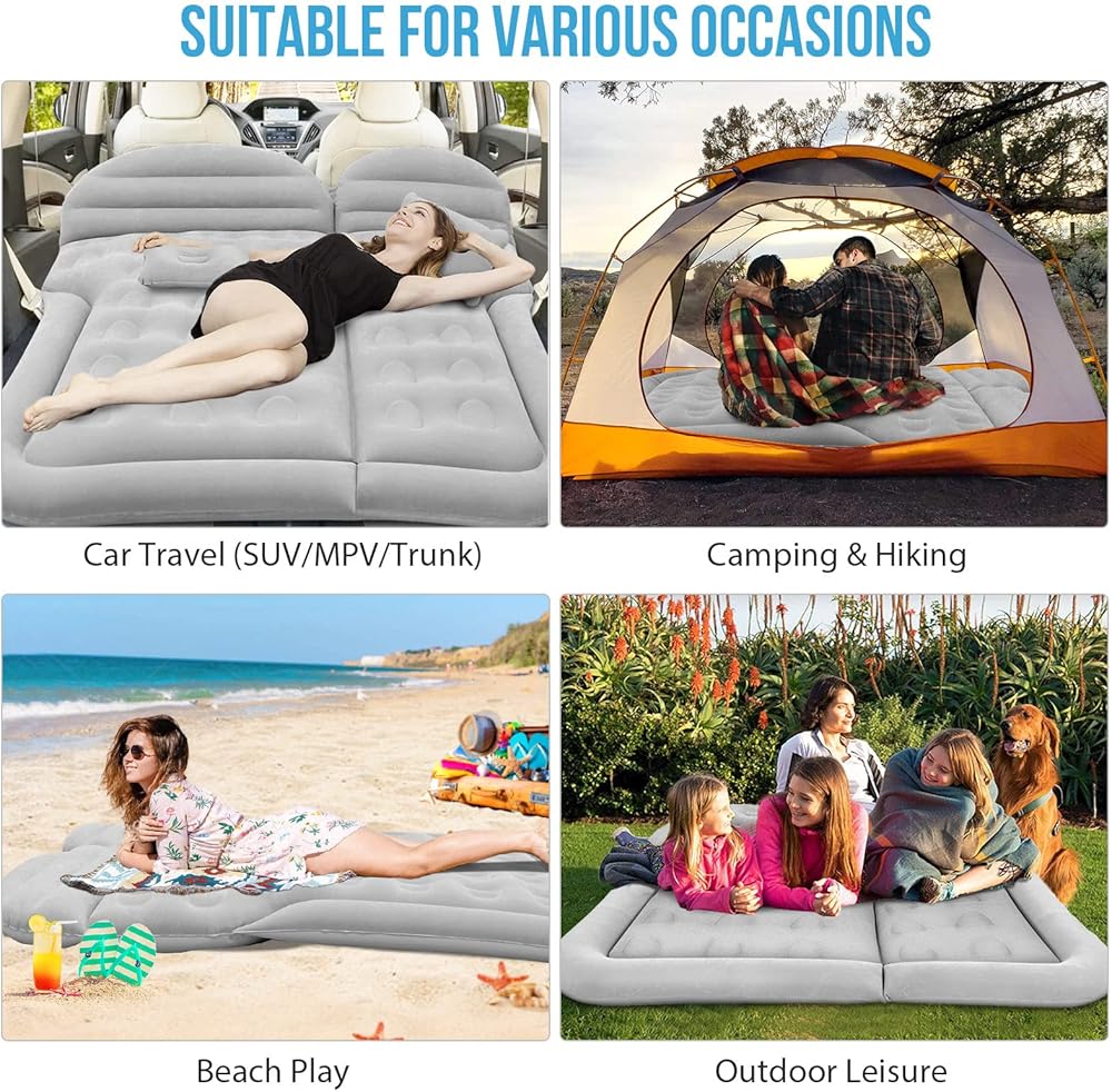 • 【يناسب معظم المركبات والمشاهد】سرير السفر بالسيارة هذا مزود بـ 6 أكياس هوائية منفصلة متوافقة مع سيارات الدفع الرباعي لاستخدام صندوق السيارة والمقعد الخلفي. يمكن استخدام المرتبة الهوائية أيضًا في مناسبات مختلفة، مثل التخييم والسفر والشاطئ والمنزل والحديقة.