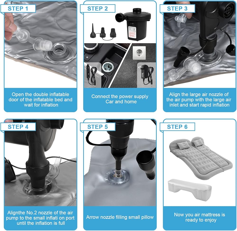 • 【سهلة النفخ/التفريغ】مجهزة بمضخة هواء كهربائية و3 أنواع من مسارات النفخ التي تدعم استخدام السيارة. يمكنك نفخ السرير الهوائي أو تفريغه بسرعة للحصول على القوة المرغوبة في غضون 6-10 دقائق، ويمكن تعديل القوة وفقًا لاحتياجاتك.