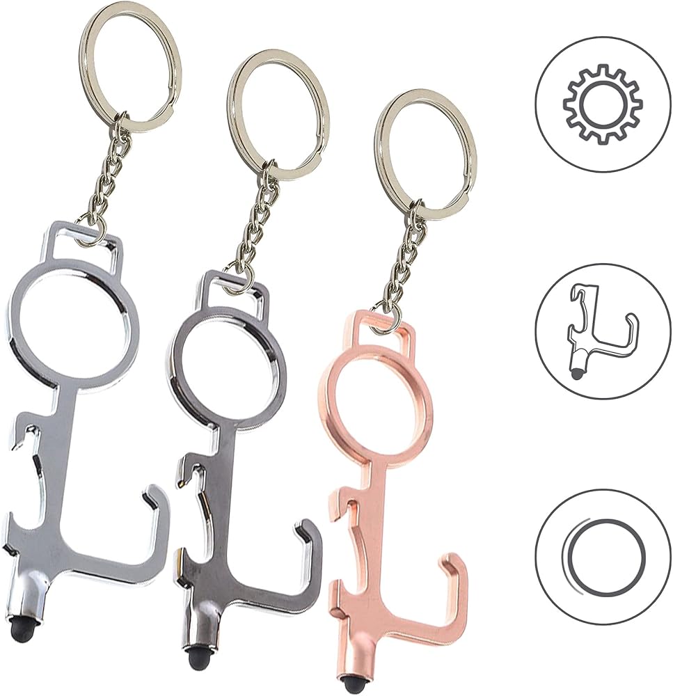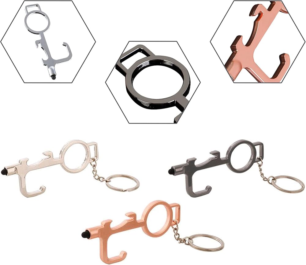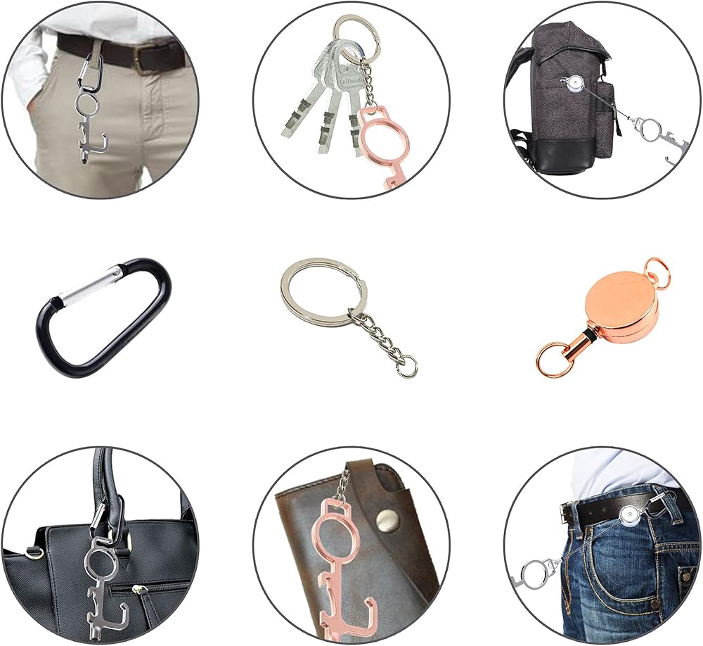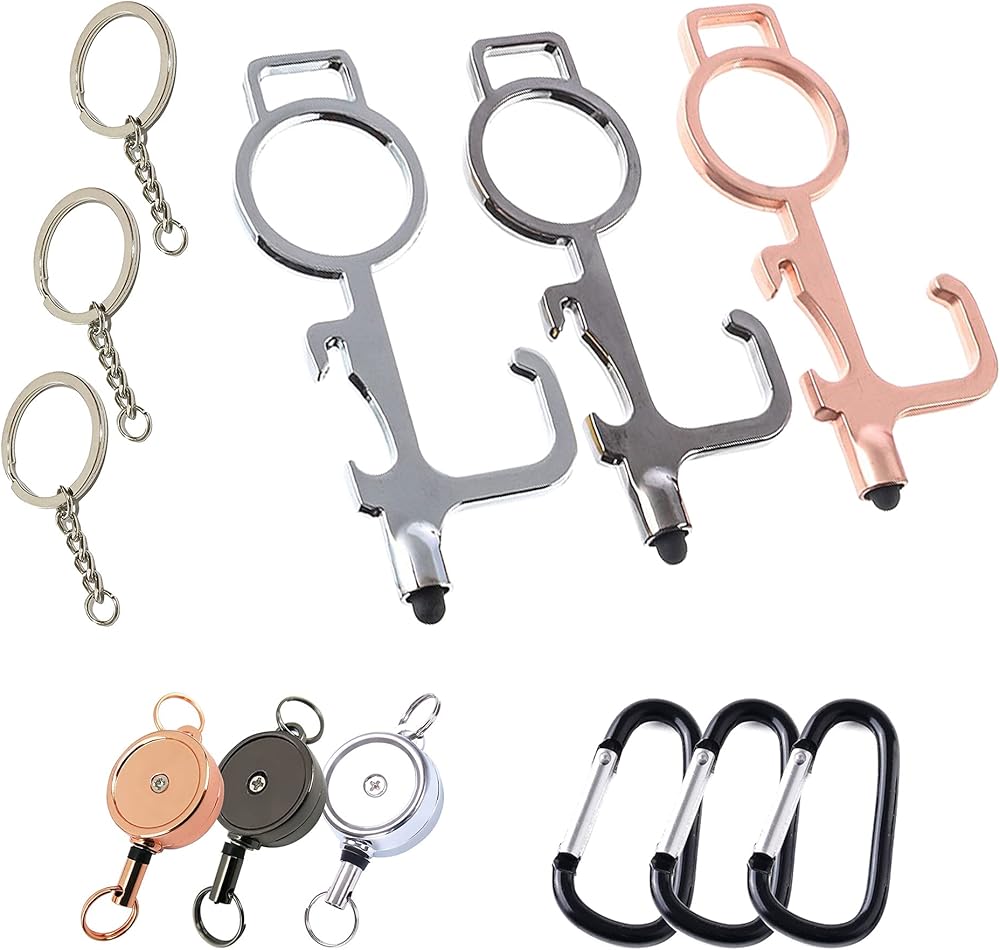 سلسلة مفاتيح متعددة الوظائف، أداة حلقة خطافية للمفاتيح، فتاحة مقبض الباب بدون استخدام اليدين، أداة دفع زر المصعد، قلم سطح الشاشة، فتاحة زجاجات معدنية، مع سلسلة/حلقة/حلقة تسلق/مشبك قابل للسحب (3 عبوات)