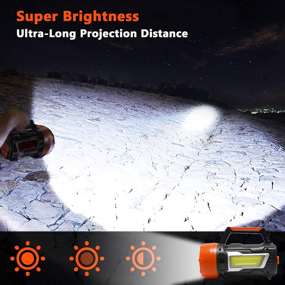 • 【محمول ومقاوم للماء】: تصميم المقبض المريح يجعل من السهل الالتقاط والوضع، كما أنه مريح للحمل. الأضواء الساطعة ذات هيكل مغلق والتصميم المختوم يجعلها مقاومة للماء بشكل رائع. ويمكنك استخدام المصباح اليدوي فائق السطوع في الهواء الطلق حتى في الأيام الممطرة.
