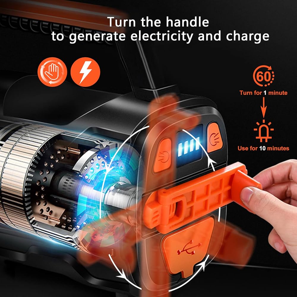 • 【وظيفة قوية - شحن كرنك يدوي】: يسمح المنتج بتوليد الكهرباء عن طريق الاهتزاز. تساعدك على توديع انقطاع التيار الكهربائي على الرغم من استهلاكك للطاقة. يهز لمدة 1 دقيقة، واستخدام لمدة 10 دقائق. يمكنك الاستمتاع بفترة ضمان لمدة عامين وخدمة عملاء ودية عبر الإنترنت على مدار 24 ساعة. إذا كان لديك أي تعليقات على المصباح الكشاف القابل لإعادة الشحن، فيرجى الاتصال بنا على الفور وسنرد عليك في الوقت المناسب.