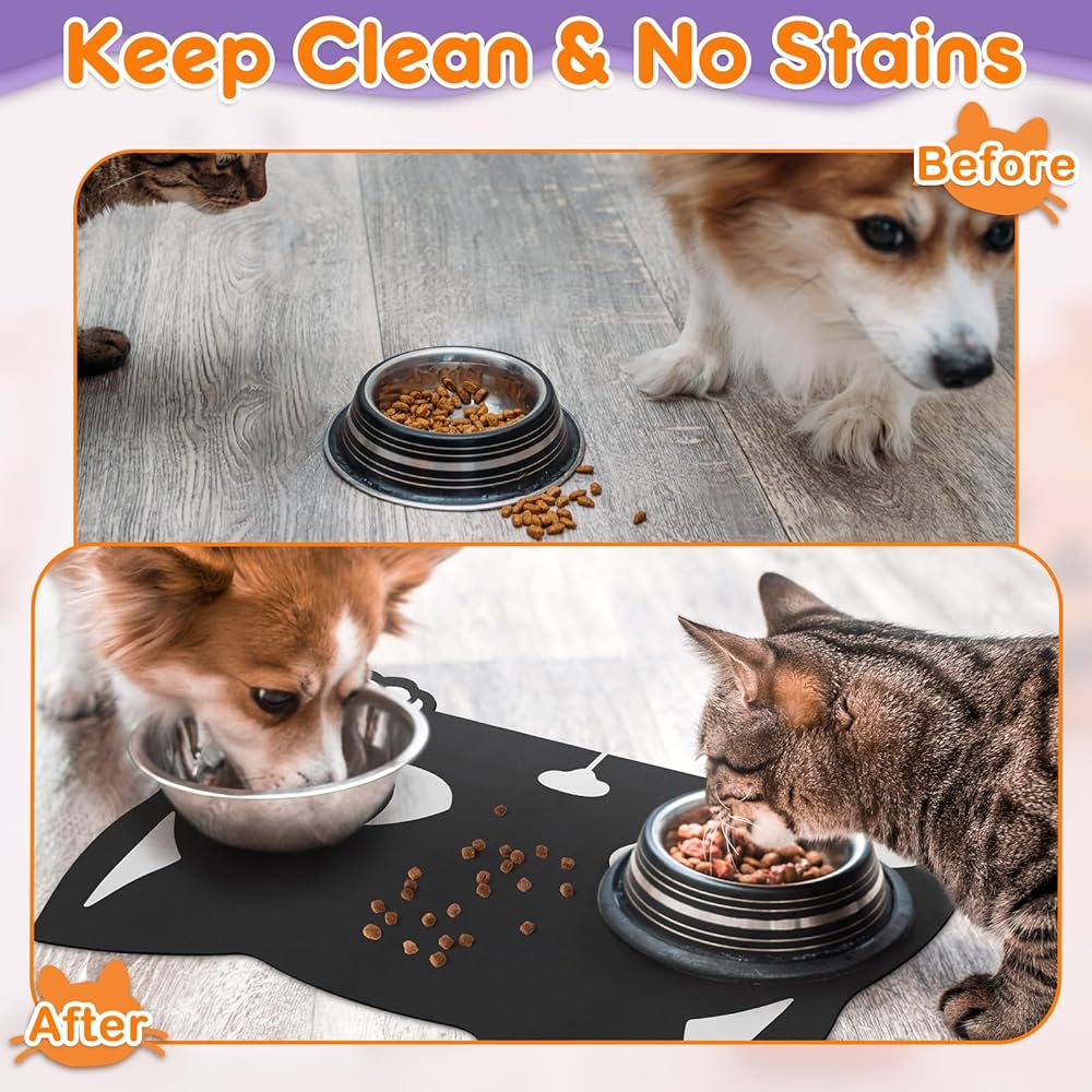 【Perfect Size】Measuring 23.6" x 15.7", this big sized pet mat for food and water comfortably fits most cat and dog bowls, from small kitten saucers to larger water bowls, keeping both food and water spills contained.
