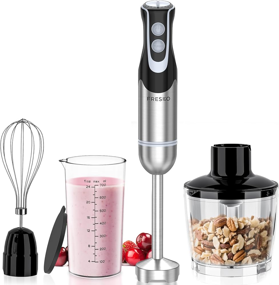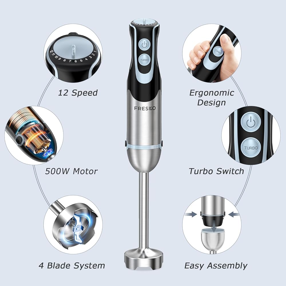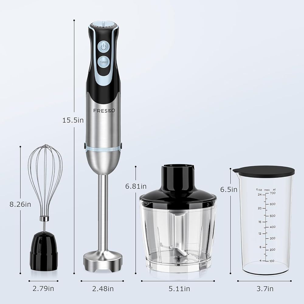 سهل التنظيف: أجزاء خلاط الطعام فريسكو قابلة للفصل وسهلة الاستخدام والتنظيف. يمكن تنظيف عصا الخلاط المصنوعة من الفولاذ المقاوم للصدأ في غسالة الأطباق.