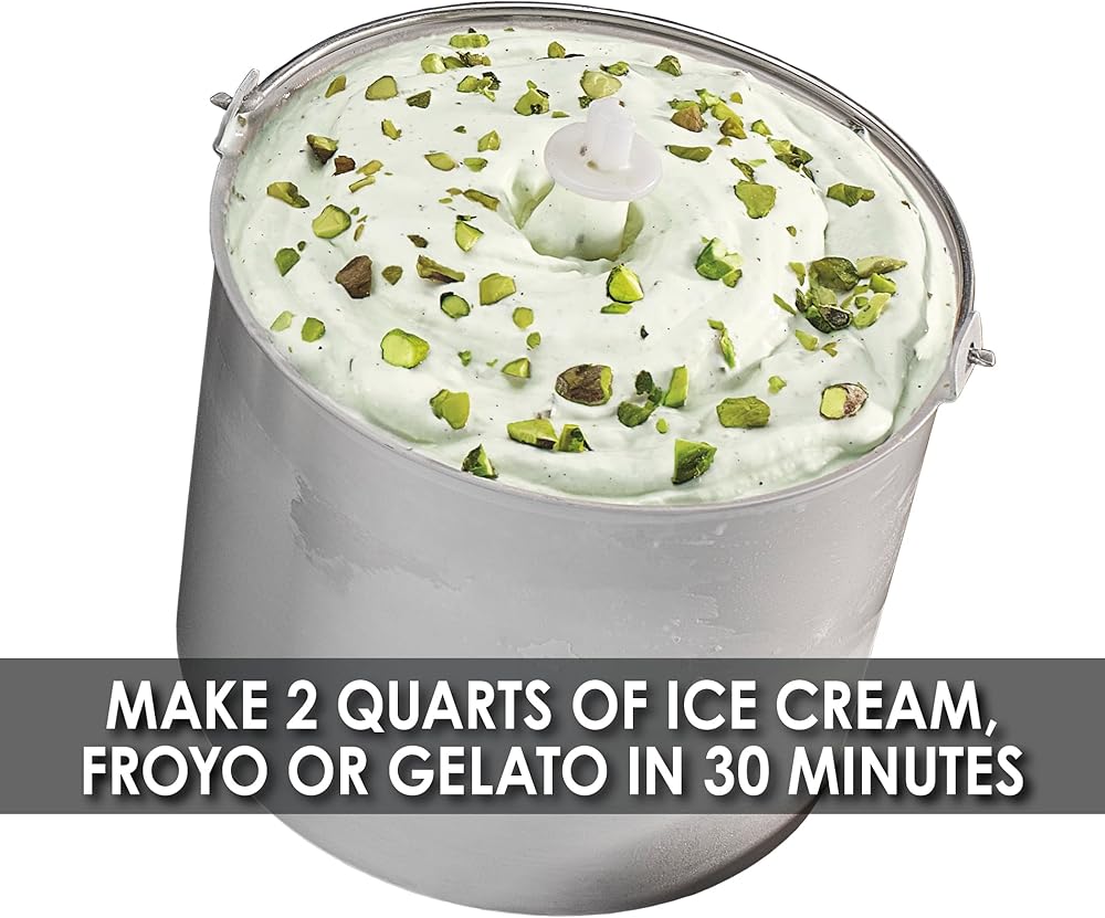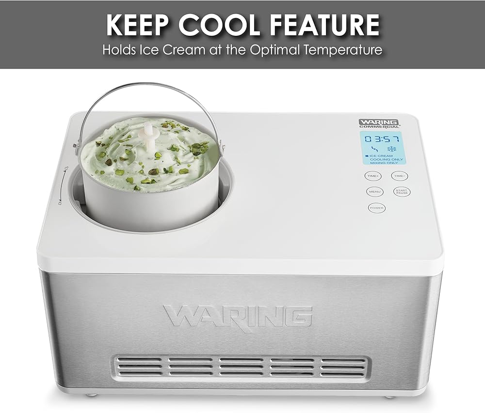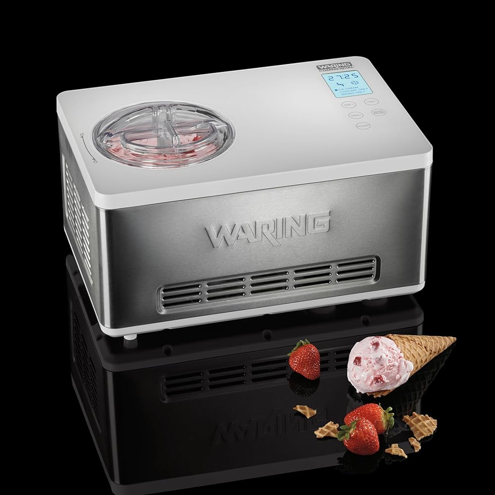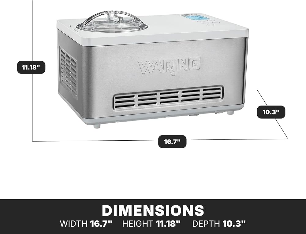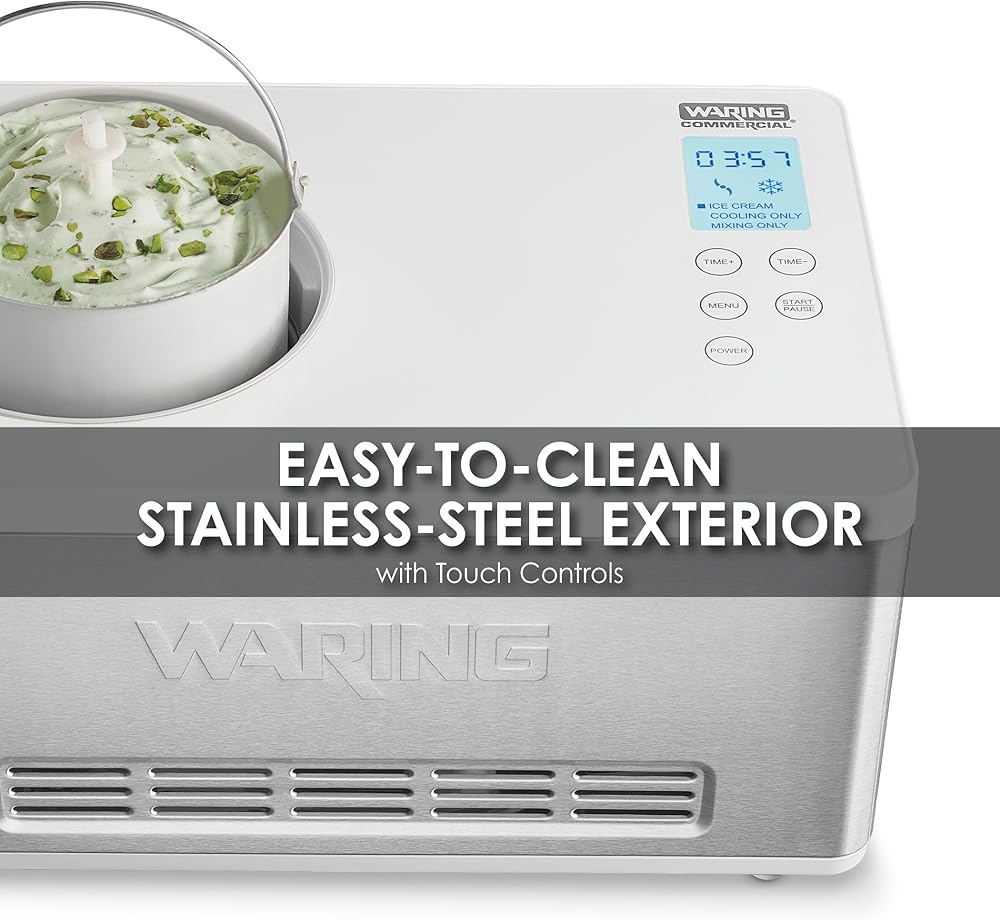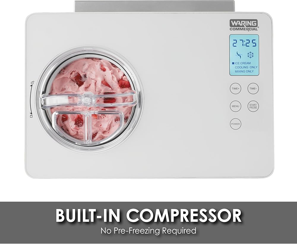 You can make up to 2.5 quarts of ice cream, frozen yogurt or gelato in as little as 30 minutes with this ice cream maker from Waring Commercial. The built-in compressor means no pre-freezing is required. The "keep cool" feature holds ice cream at the optimal temperature when the process is finished.Model #: WCIC25 2.5 quart capacity Built-in compressor Easy-to-clean stainless steel exterior LCD display "Keep Cool" feature 6073363
