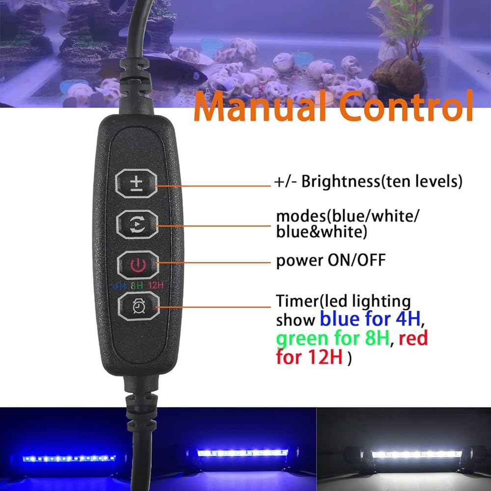 4.Please Note: Timer led lighting: Blue for 4H, Green for 8H, Red for 12H. Once you set a timer, this tank light will auto ON/OFF for every 24 hours.