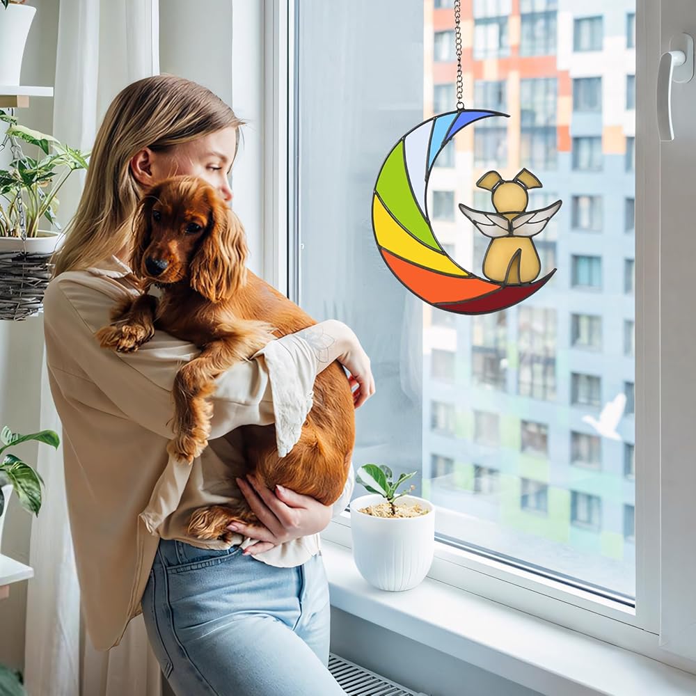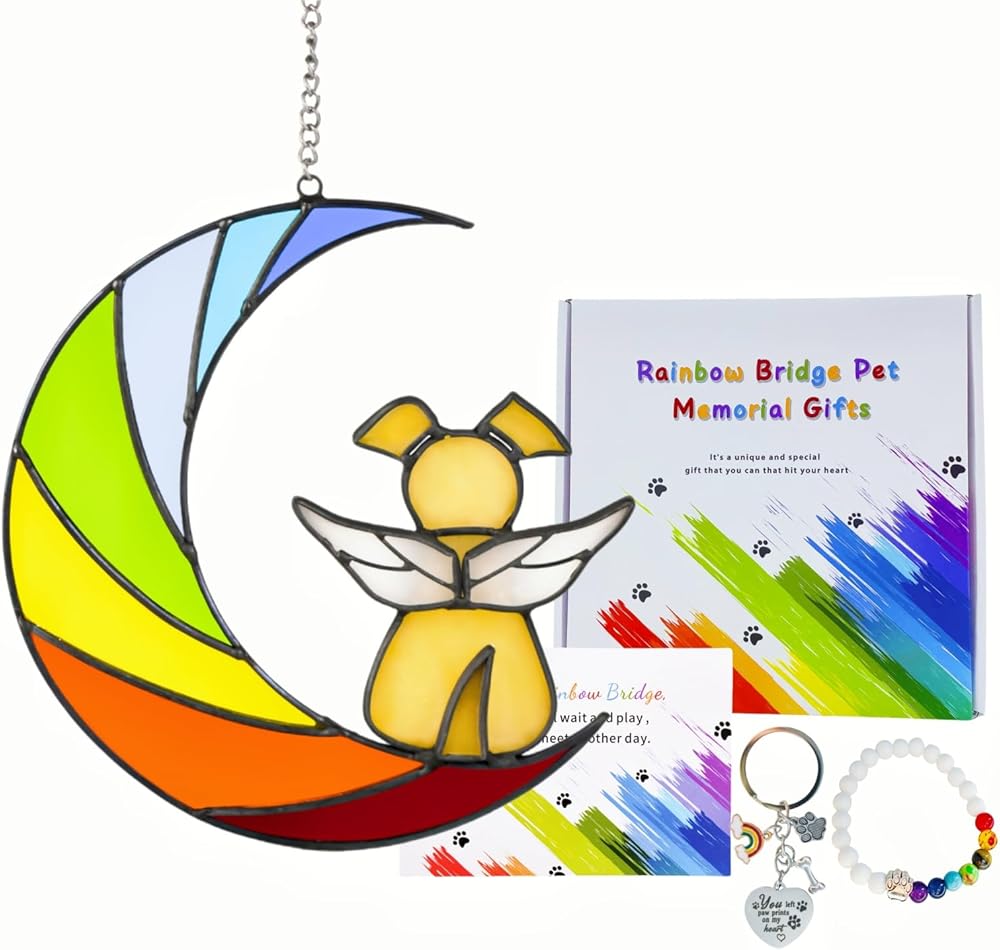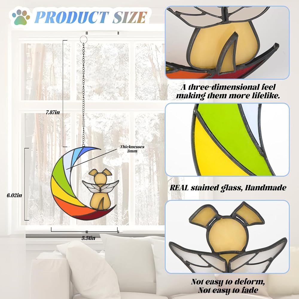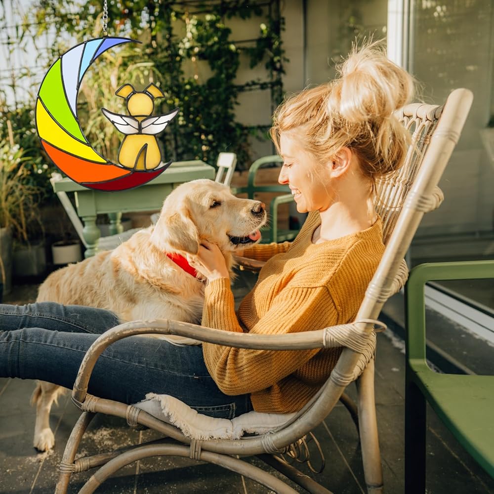 🐶【تصميم فريد من نوعه】 هدية تذكارية للكلاب على شكل جسر قوس قزح مثالية لمحبي الكلاب الذين فقدوا حيوانهم الأليف للتو، فهي تتميز بجرو ملاك على قمر قوس قزح ذو 7 ألوان، وأجنحة الكلاب وأجزاء الذيل مصنوعة من قطع زجاجية صغيرة تم قطعها يدويًا وتجميعها معًا، مما يعطي إحساسًا ثلاثي الأبعاد ويجعلها أكثر واقعية. عندما تشرق الشمس من خلاله، الزجاج الشفاف الملون في ضوء مختلف، ستتغير شفافيته وملمسه ولونه مع تغير الضوء، ويظهر مشرقًا ويجلب المتعة والسعادة، ويذكرك بالوقت الممتع مع الكلب.