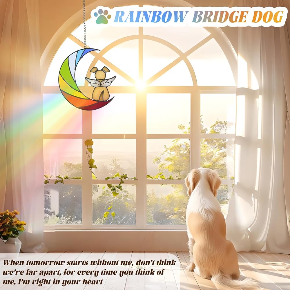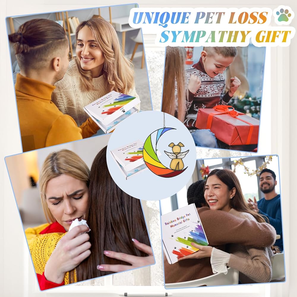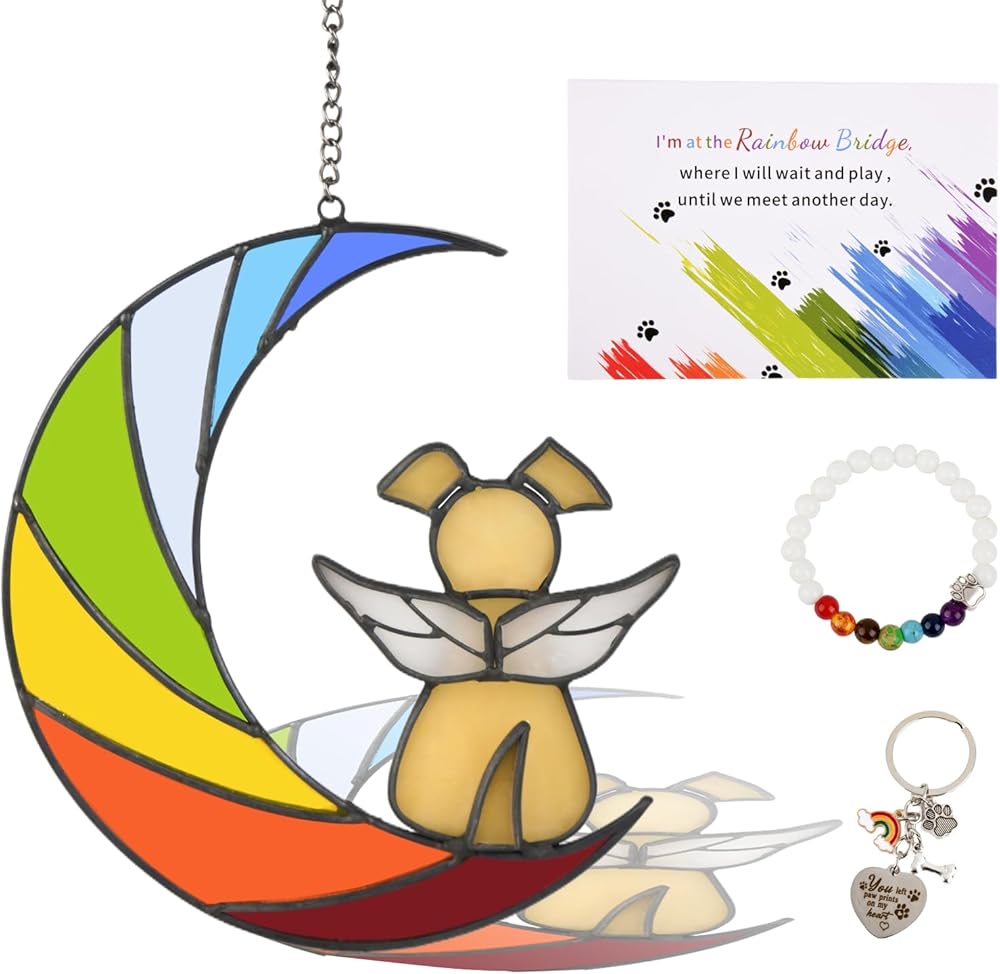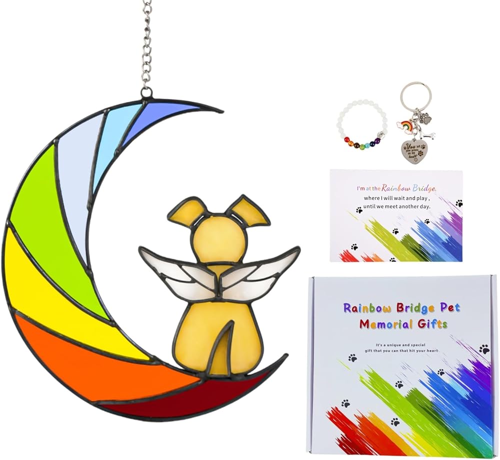 🐶【تصميم فريد من نوعه】 هدية تذكارية للكلاب على شكل جسر قوس قزح مثالية لمحبي الكلاب الذين فقدوا حيوانهم الأليف للتو، فهي تتميز بجرو ملاك على قمر قوس قزح ذو 7 ألوان، وأجنحة الكلاب وأجزاء الذيل مصنوعة من قطع زجاجية صغيرة تم قطعها يدويًا وتجميعها معًا، مما يعطي إحساسًا ثلاثي الأبعاد ويجعلها أكثر واقعية. عندما تشرق الشمس من خلاله، الزجاج الشفاف الملون في ضوء مختلف، ستتغير شفافيته وملمسه ولونه مع تغير الضوء، ويظهر مشرقًا ويجلب المتعة والسعادة، ويذكرك بالوقت الممتع مع الكلب.