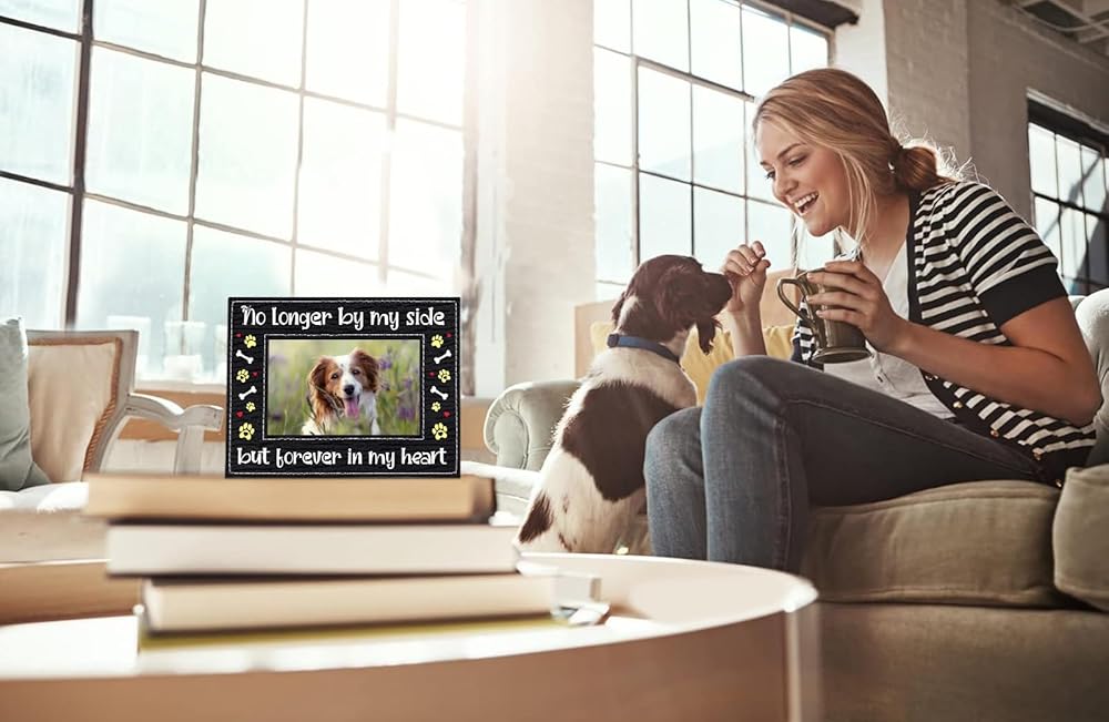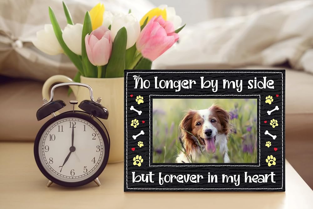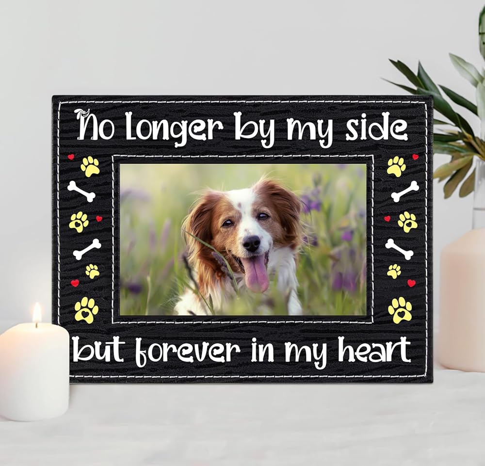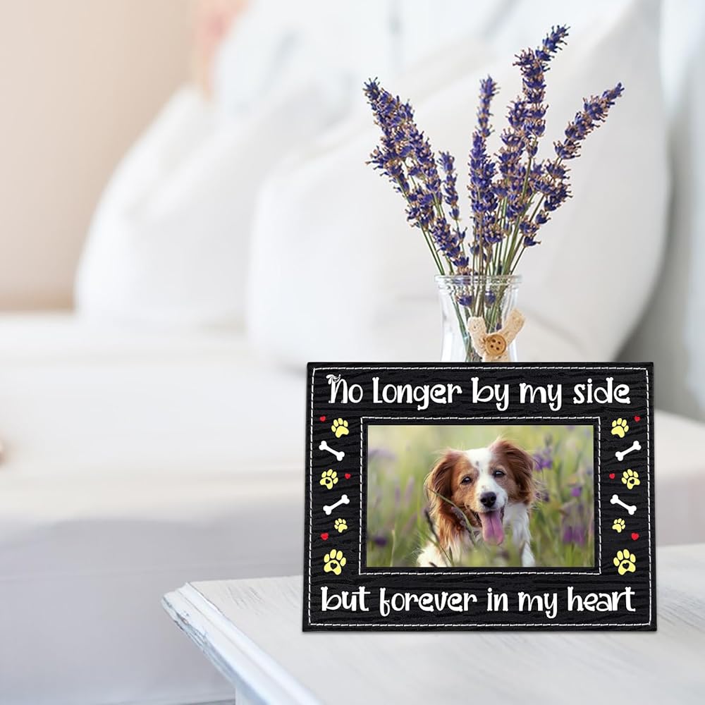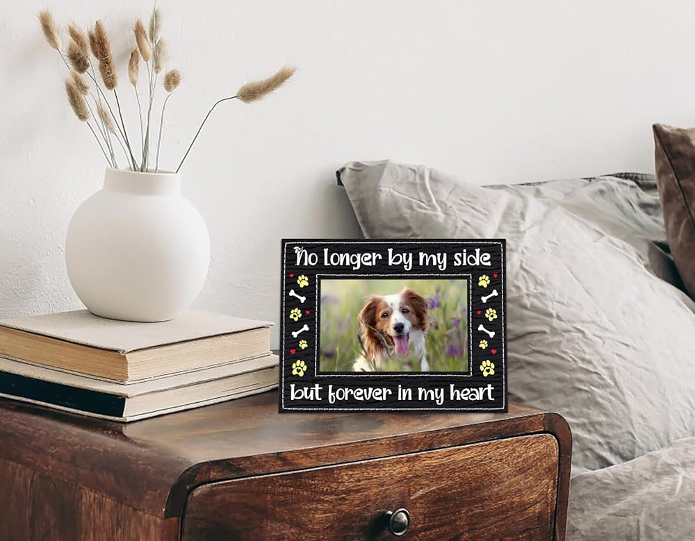 [Table Top Dog Memorial Picture Frame]: Our loss of dog sympathy gift features a classic wooden frame engraved with the heartfelt phrase "No longer by my side but forever in my heart". Its timeless design and rustic charm make it a cherished keepsake to honor your beloved pet's memory, providing solace and comfort during difficult times.