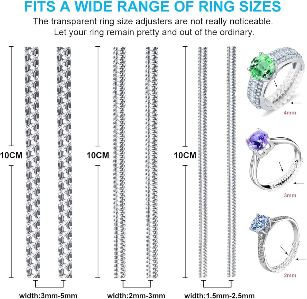 توافق متعدد الاستخدامات: 6 مقاسات متنوعة في عبوة واحدة. ساعد في تقليل حجم الخاتم بحوالي 0.5-1 حجم. تم تصميم أداة ضبط حجم الخاتم خصيصًا للخواتم الفضفاضة، وهي متوافقة مع جميع أنواع الخواتم، بما في ذلك خواتم الزفاف وإكسسوارات الموضة. احفظ خواتمك الثمينة من عدم الاستخدام واستمتع بأسلوب مناسب تمامًا مع فواصل الحلقات القابلة للتعديل.