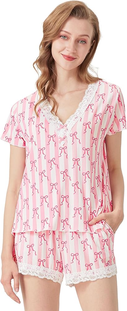 Buttery Soft: 95% Viscose made from Bamboo, 5% Spandex. This women's pajama shorts set is breathable and cool to wear. Our moisture-wicking loungewear is ideal for hot weather and night sweats, providing a comfortable wearing experience.