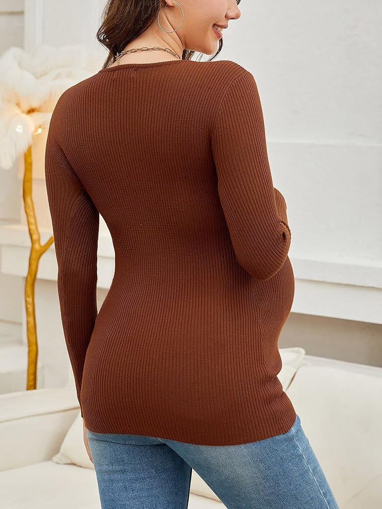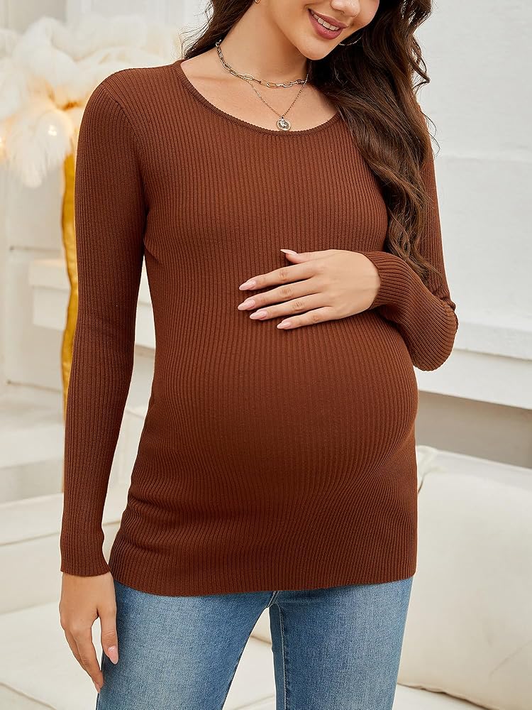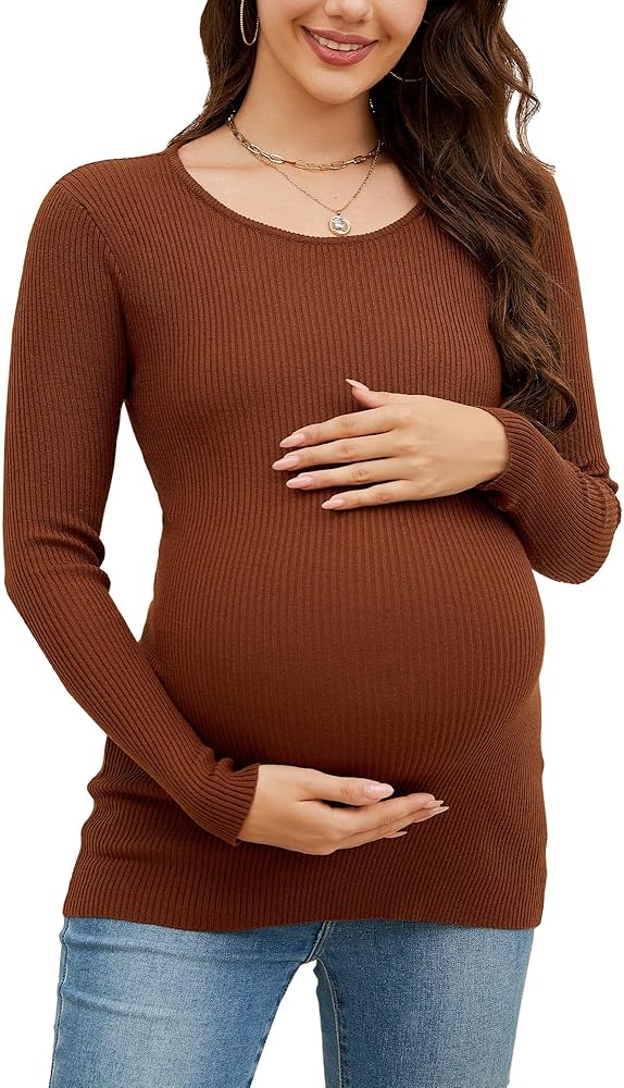 🍁 CLASSIC DESIGN: Maternity tops is featured with fine rib-knit detailing, Crewneck, long sleeve, slim fit, classic solid color, simple but all-match, is perfect to wear solo or as a layering piece with an cardigan or jacket.