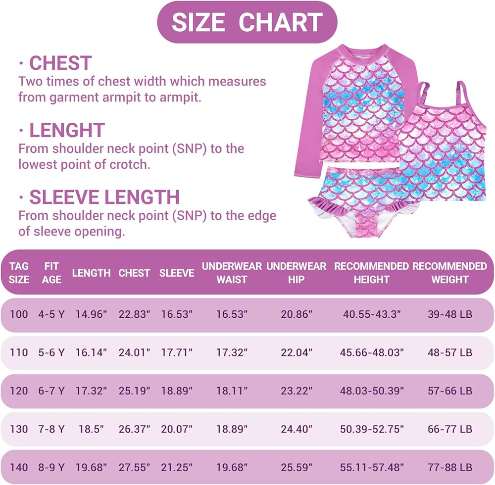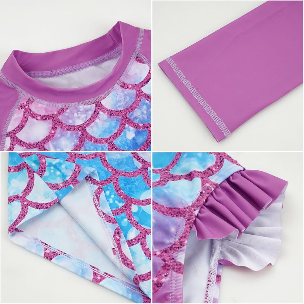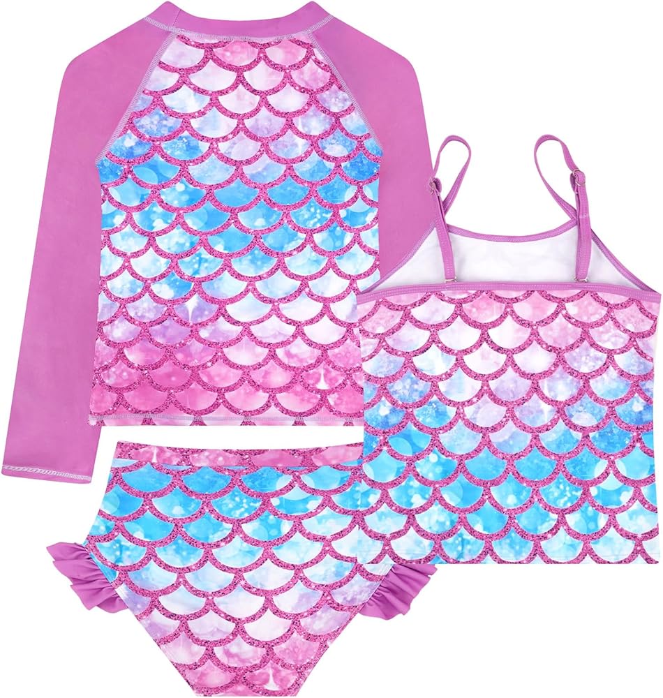 【طقم ملابس سباحة للفتيات من ثلاث قطع】طقم ملابس سباحة للفتيات مكون من 3 قطع يشتمل على واقي من الطفح الجلدي بأكمام طويلة وياقة مدورة وتانكيني بأشرطة قابلة للتعديل وسروال قصير رائع مكشكش. توفر ملابس السباحة المقسمة مرونة أكبر للفتيات في مرحلة النمو. مجموعة متنوعة من المطبوعات اللطيفة والعصرية لتختار من بينها، طقم ملابس السباحة المكون من 3 قطع يمنحك مرونة أكبر لتناسب أطفالك.