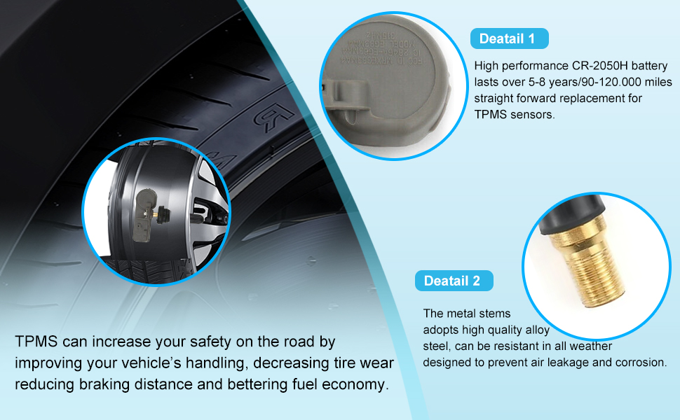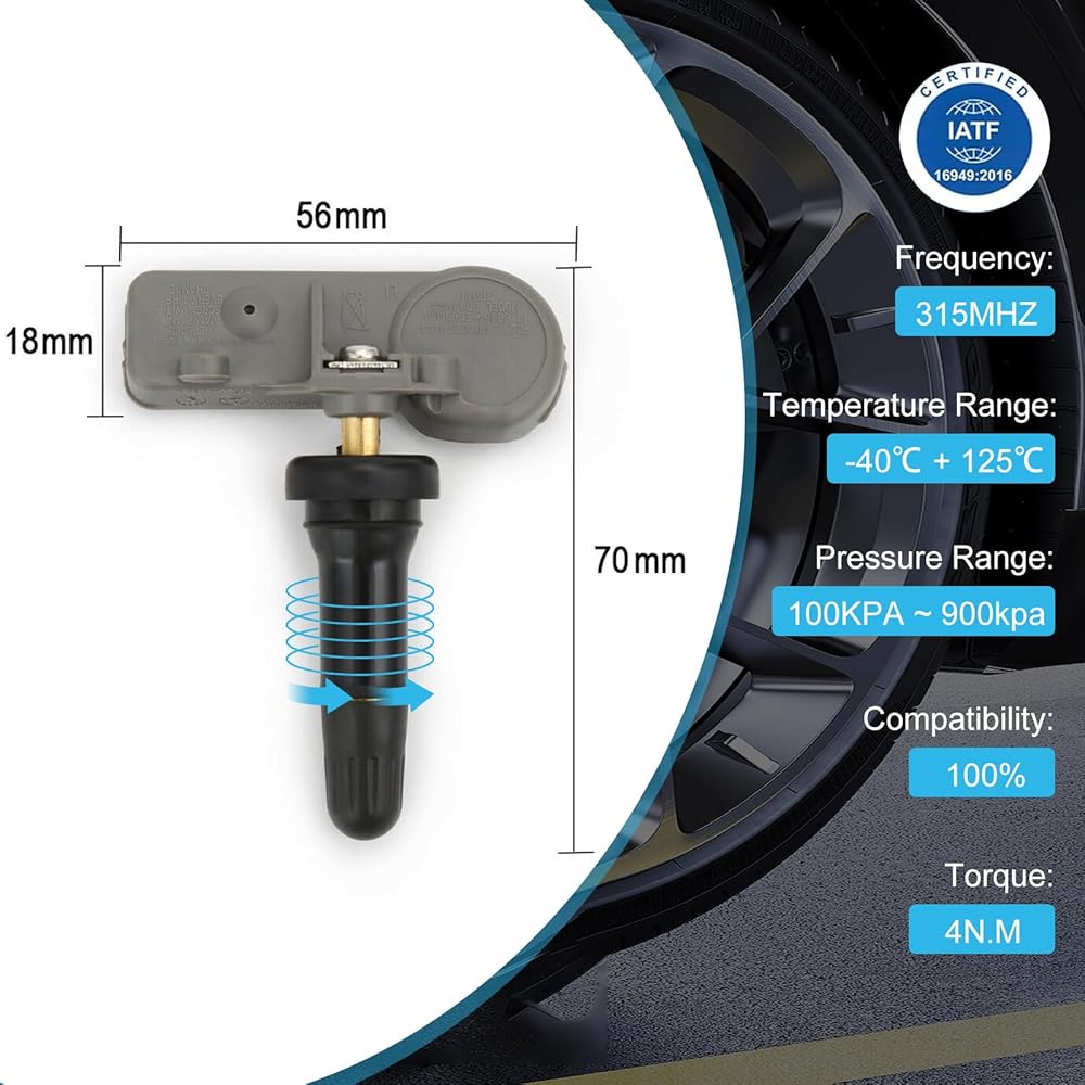 قابلية الاستخدام: مستشعر TMPS يناسب Buick Allure (2008)، لـ Buick Enclave (2018-2009)، لـ Cadillac CTS (2014-2008)، لـ Cadillac DTS (2011-2007)، لـ Cadillac Escalade (2018-2007)، لـ كاديلاك إسكاليد ESV (2018-2007)، لسيارة شيفروليه أفالانش (2013-2007)، لسيارة شيفروليه أفيو (2011-2007)، لسيارة شيفروليه Aveo5 (2011-2007)، لسيارة جي إم سي أكاديا (2012-2009)، لسيارة جي إم سي إنفوي (2009) -2007)، لجي إم سي سافانا 1500 (2018-2010)، لبونتياك G3 (2010-2008)، لبونتياك G3 ويف (2009)، لبونتياك G5 (2010-2008).