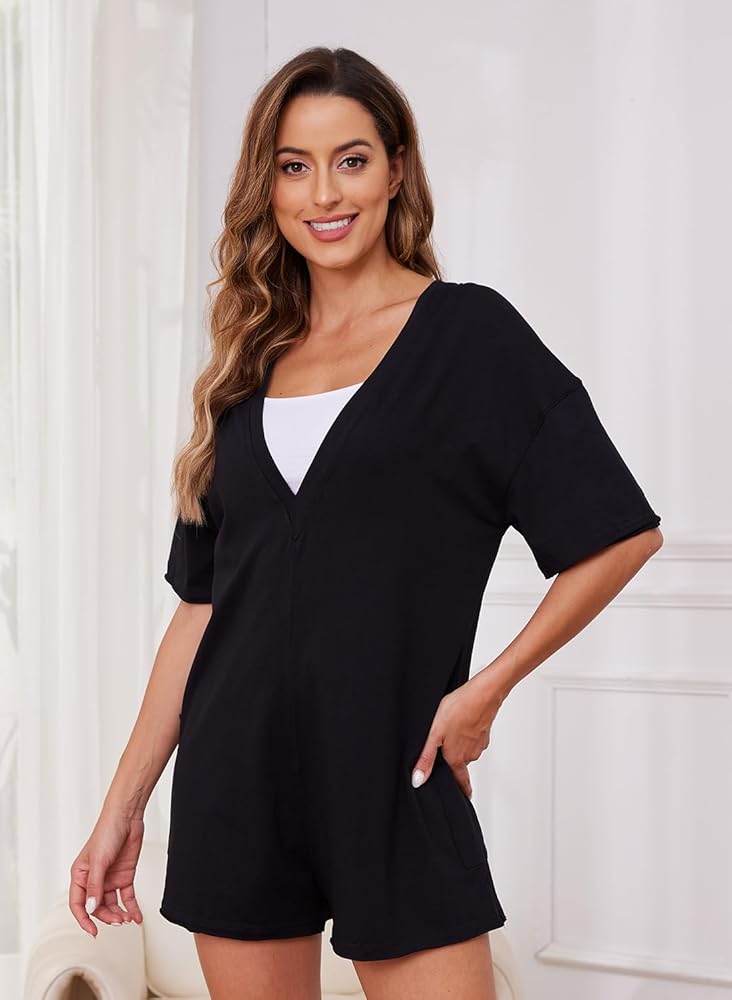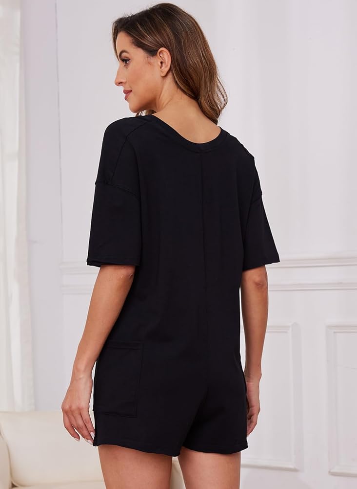 Key Features: Featuring short sleeves, a chic V-shaped back, and dropped shoulders, this onesie exudes casual elegance. With two practical patch pockets at the front, conveniently store your essentials like your phone, keys, and cards.