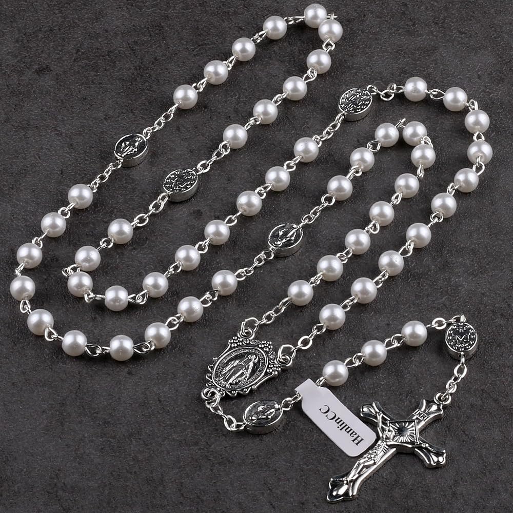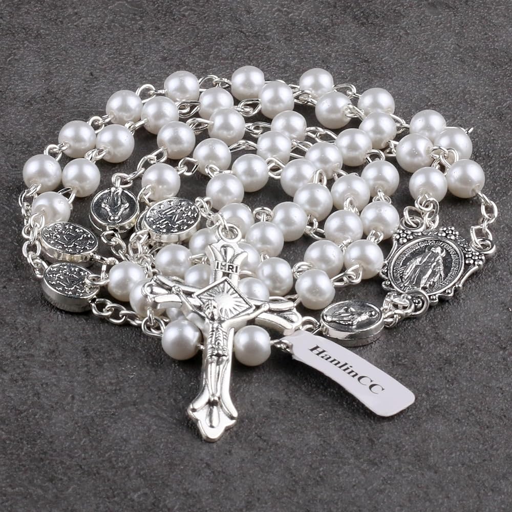 The glass pearl beads rosary Hail Mary beads size is 6mm, our father beads are 8x10mm Miraculous Metal beads with Anti-Silver plated, it is make us can pray with your eyes closed and know you have reached the end of a decade and can meditate on the next Mystery of the rosary.