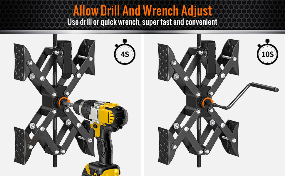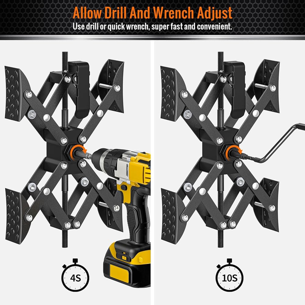 السماح بضبط المثقاب ومفتاح الربط: يدعم مثبت RV على شكل X من Sulythw كلاً من طرق تركيب مفتاح الربط والمثقب، وتأتي المجموعة مجهزة بمفتاح ربط سريع ومحول مثقاب. مع مثقاب كهربائي، يمكن تأمين مثبت عجلة RV بسرعة في ثوانٍ. إنه حقًا موفر للعمالة. يقوم مفتاح الربط مباشرة بضبط توسع وانكماش مثبت الإطارات RV. يتطلب تركيب المثقاب توصيل محول الحفر.