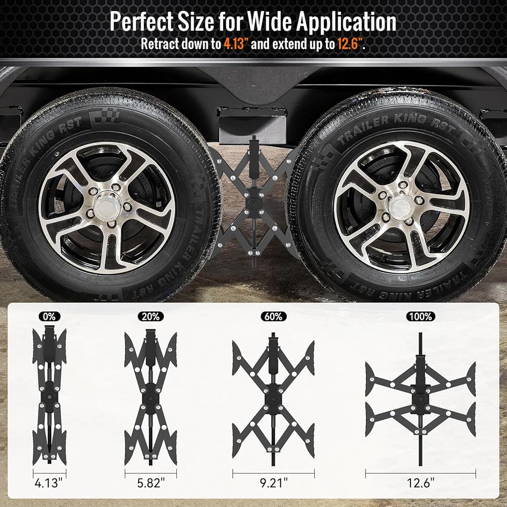 حجم مثالي للاستخدام على نطاق واسع: يمكن أن تتراجع أحزمة عجلة التخييم إلى 4.13 بوصة وتمتد حتى 12.6 بوصة. تطبيقات لـ: مقطورة تخييم، عربة سكن متنقلة، شاحنات شديدة التحمل، مقطورة العجلة الخامسة، مقطورات العجلات الترادفية، شاحنة نقل الألعاب، منازل متنقلة، إلخ. قائمة التعبئة: مثبت عجلة الشوك على شكل X x1؛ مفك صامولة 1/2 x1؛ مفتاح ربط سريع x1. يرجى ملاحظة: لا يتم تضمين الحفر.