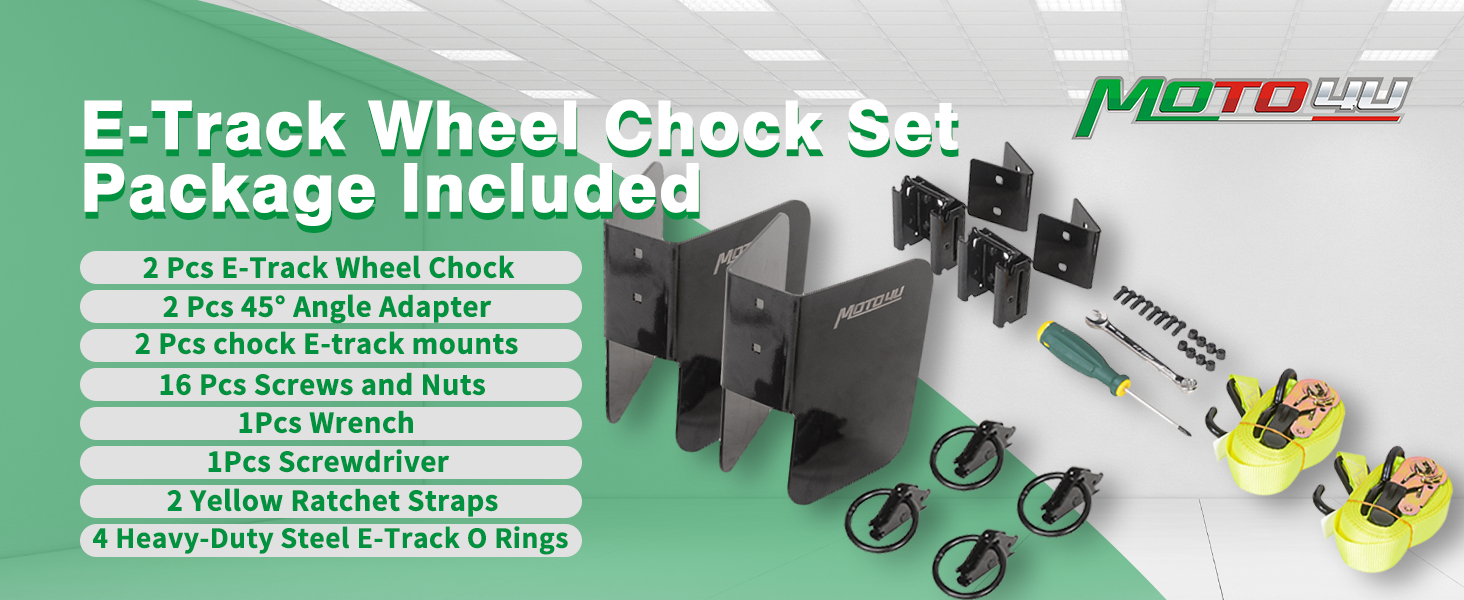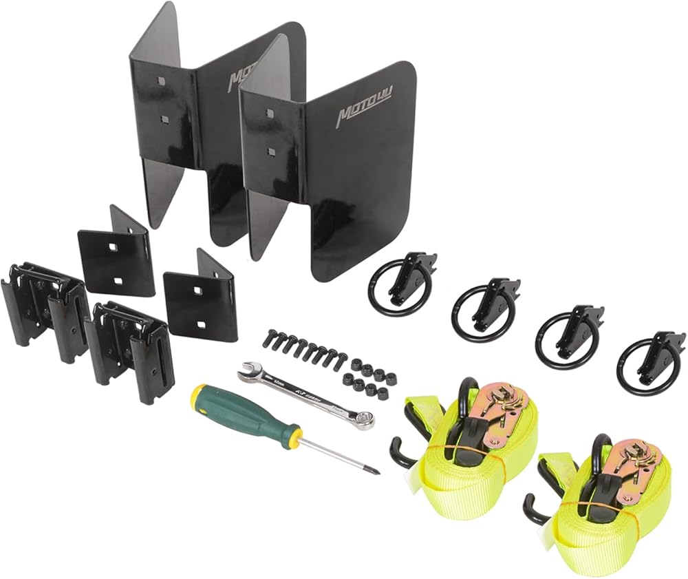 【تشمل العبوة: قطعتان من حواجز العجلات E-Track، قطعتان من حوامل المسار الإلكتروني، 4 حلقات O من الفولاذ عالي التحمل و2 حزام سقاطة أصفر، 2 قطعة محولات زاوية 45 درجة، 10 قطع براغي وصواميل، 1 مفتاح ربط قطعة، ومفك براغي قطعة واحدة.
