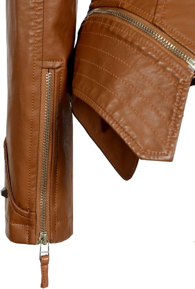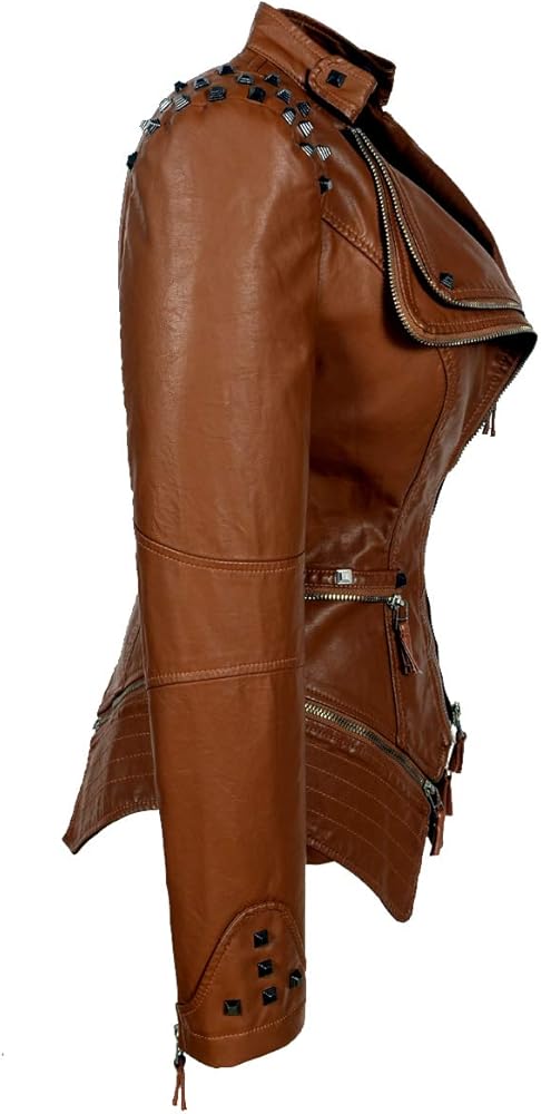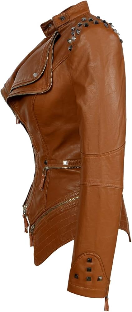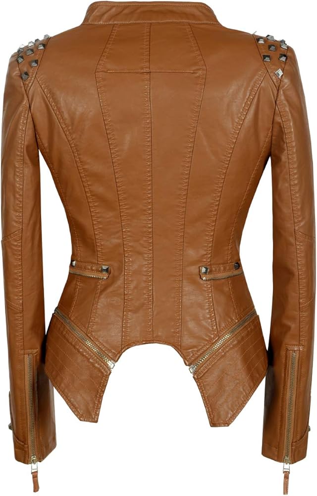 المميزات: سترة جلدية كلاسيكية، مع ترصيع برشام عند الكتف والخصر، وإغلاق بسحاب مزدوج وتصميم متوافق مع الطراز الخالد.
