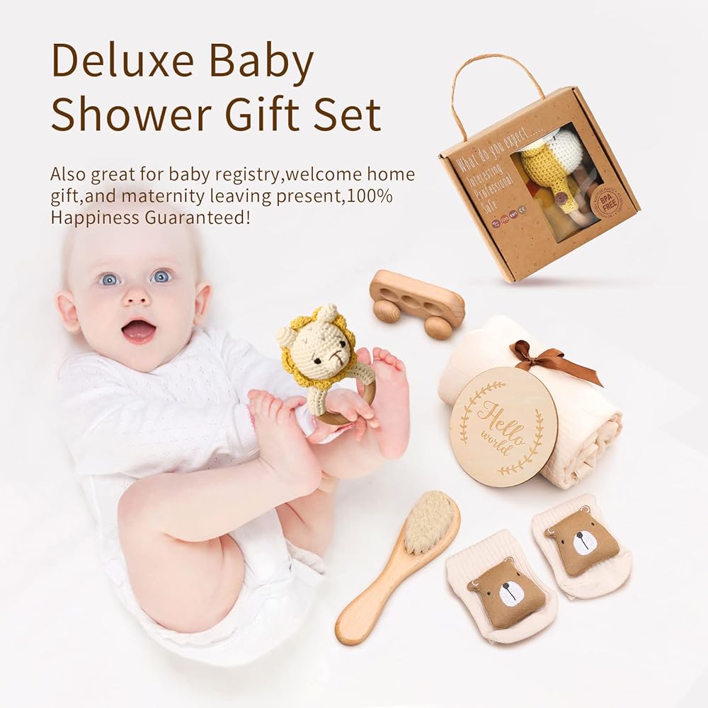 جودة عالية - كانت المنتجات الجيدة والجودة الجيدة دائمًا هي أساس منتجاتنا. بطانية الأطفال وجوارب الأطفال مصنوعة من القطن عالي الجودة مما يوفر لطفلك أقصى قدر من النعومة. السيارة الخشبية، الفرشاة الخشبية، القطعة الخشبية المميزة مصنوعة من الخشب الطبيعي ولا تحتوي على نتوءات، مما يضمن سلامة الطفل عند الاستخدام.