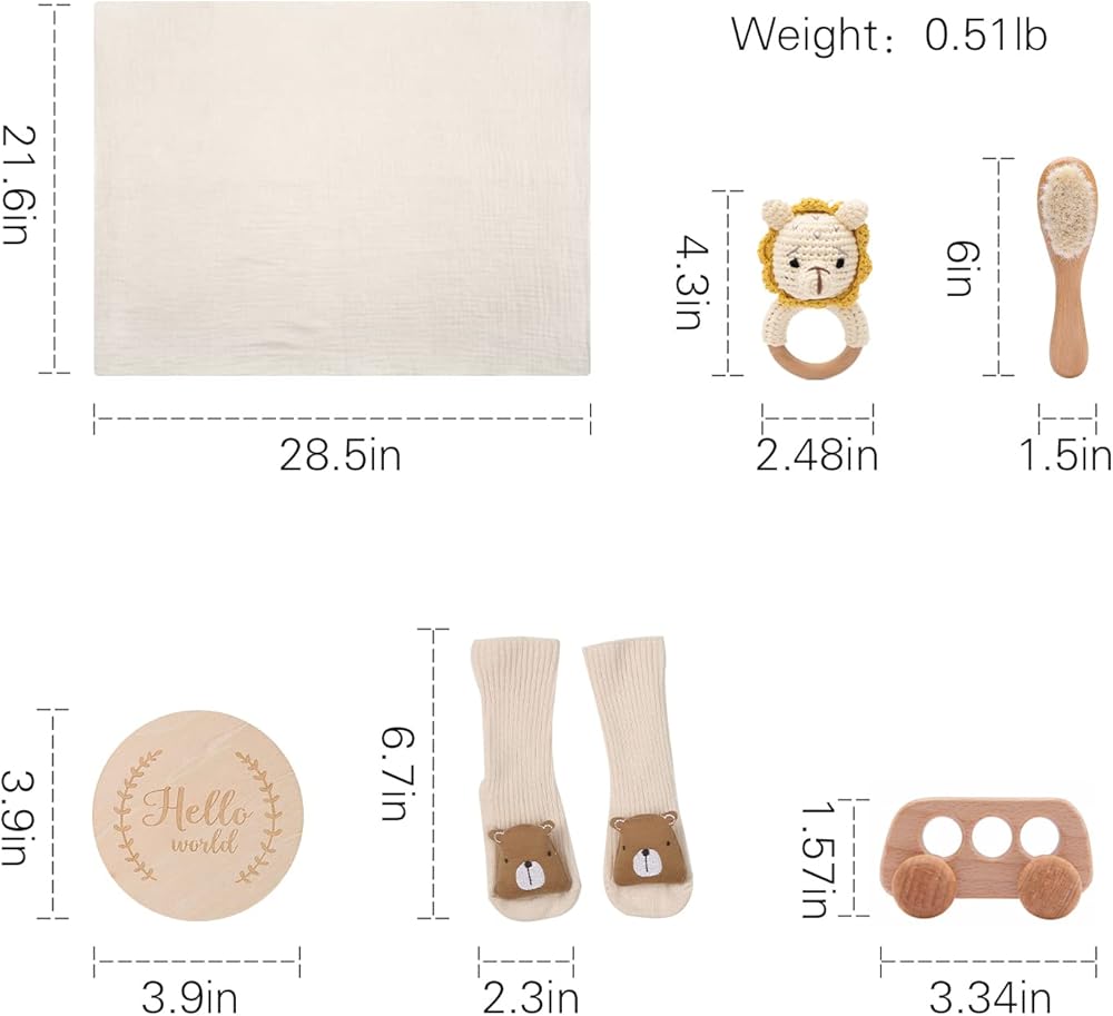 مقاس المنتج - مقاس بطانية الطفل 21.65 سم × 28.54 سم. حجم البطانية يكفي فقط للف طفل حديث الولادة، ولا يتسبب في سقوط البطانية بأكملها. تم تصميم فرشاة الأطفال وخشخيشة الأسد والسيارة الخشبية وفقًا لحجم الطفل الذي يمكن أن يحمله.
