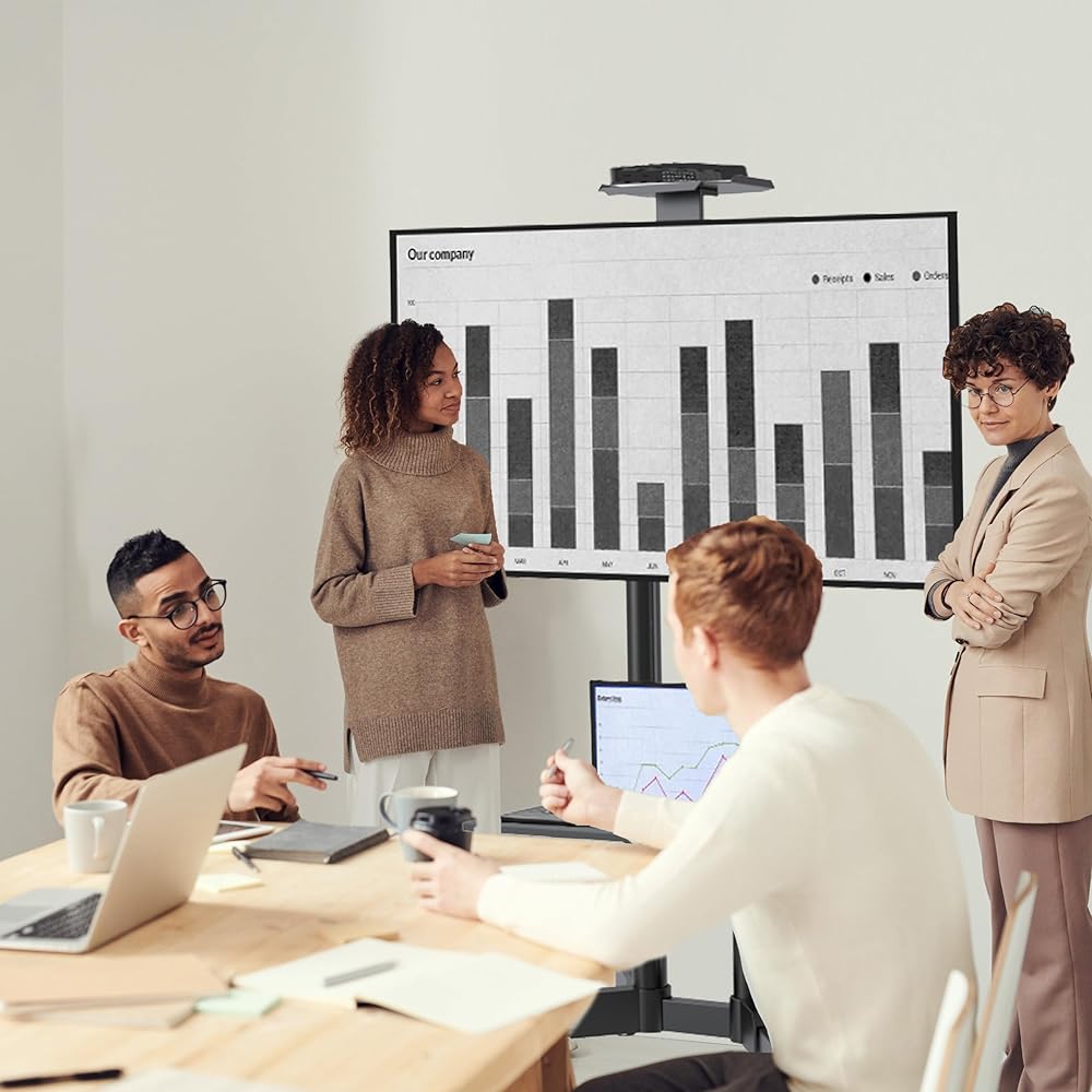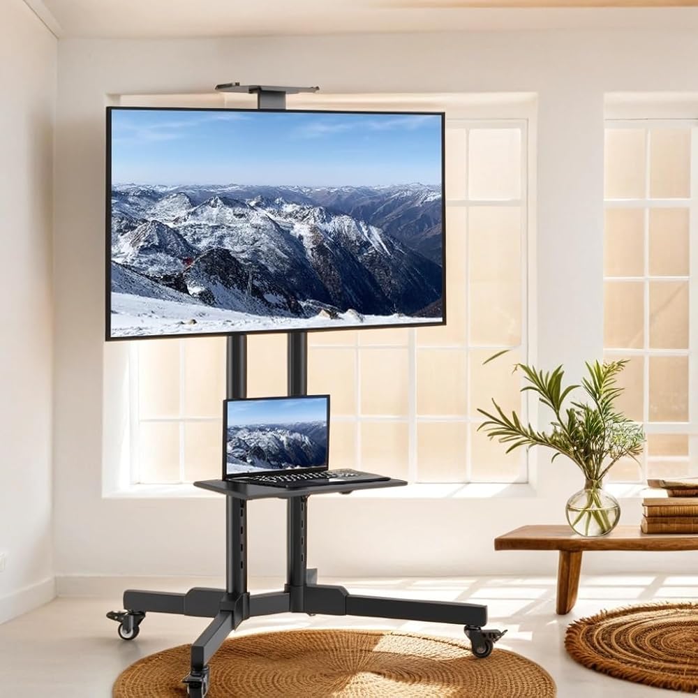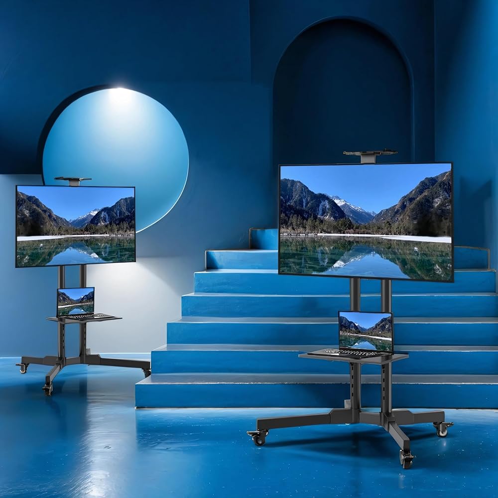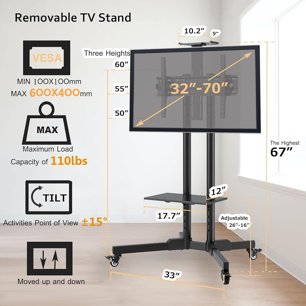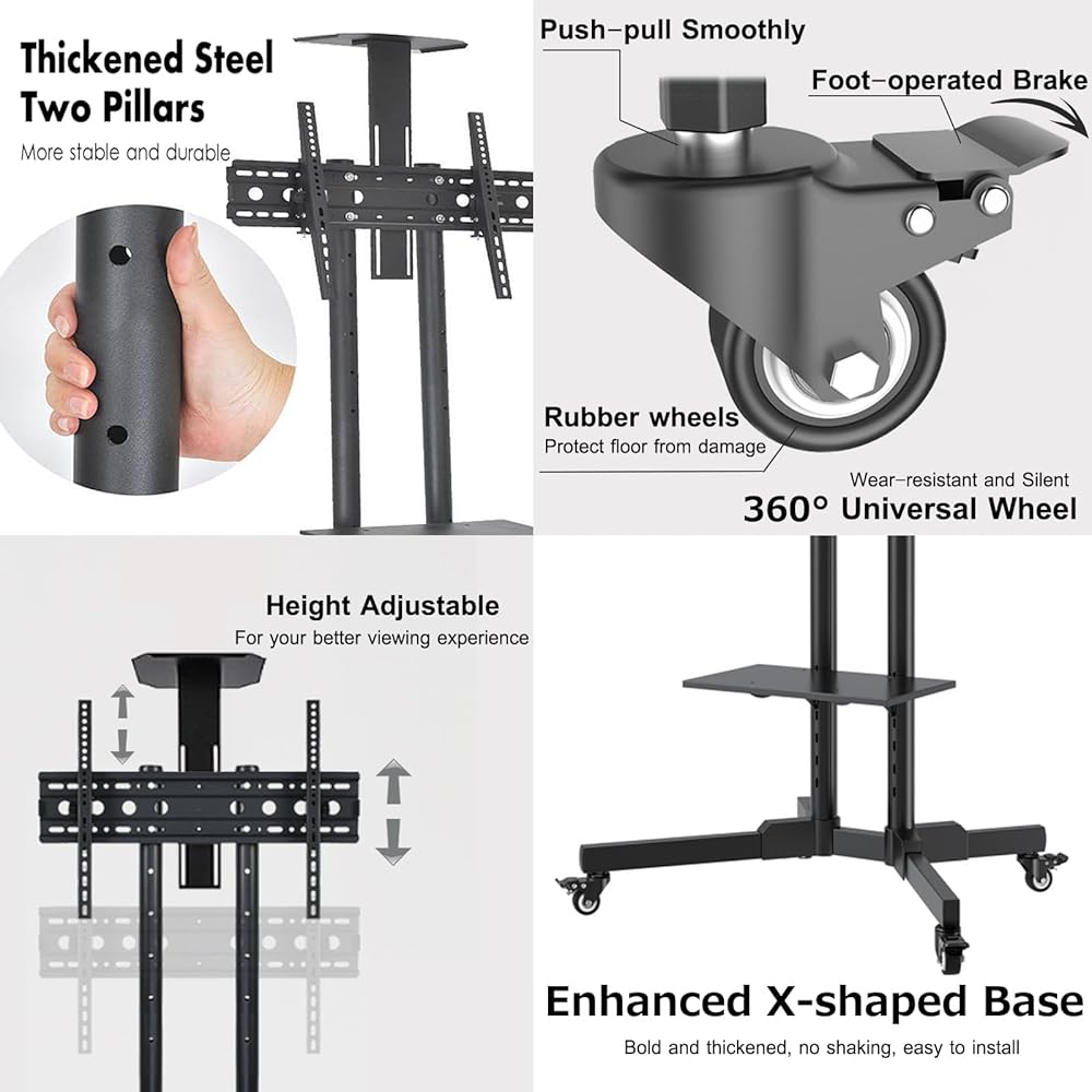 [المتانة والثبات]: تم تصميم حوامل التلفزيون المحمولة لتدوم طويلاً، بمواد متينة وبنية توفر الثبات والدعم للتلفزيون. ويأتي مع 4 عجلات مطاطية مع مكابح، مما يتيح لك تحريك التلفزيون بسهولة على الأرضيات والسجاد دون التسبب في أي ضرر أو إحداث ضجيج.